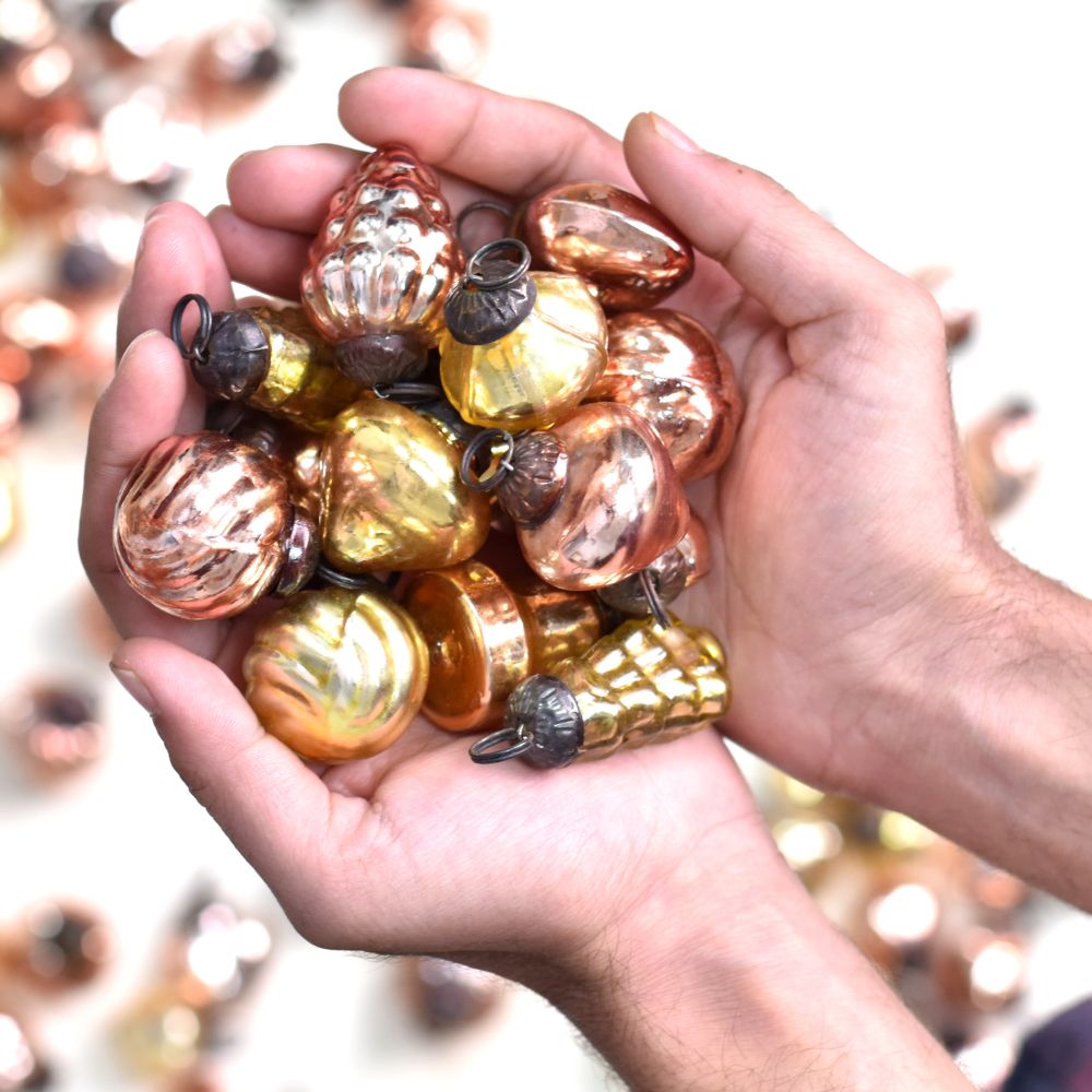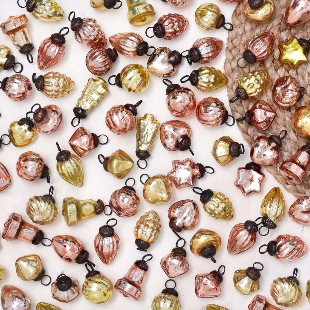 Enhance your holiday decor with our exquisite Glass Christmas ornaments that is crafted in mesmerizing Rose gold and gold hues. Each ornament is a testament to the craftsmanship of highly skilled Indian artisans, who have poured their expertise into creating these stunning pieces by hand. This set offers a diverse array of shapes, adding depth and dimension to your festive adornments. From classic spheres to intricate snowflakes and charming figurines, our ornaments are designed to captivate and inspire. These versatile decorations are perfect for any occasion and setting. Whether adorning your home, office, hotel, or shop, they infuse an aura of elegance and festive cheer. During the holiday season, they effortlessly transform your space into a winter wonderland, while on various festivals, they radiate joy and celebration. Surprise your family, friends or relatives with these unique, handcrafted ornaments, making for thoughtful and cherished gifts on special or festive occasions. Share the joy, beauty, and the rich cultural heritage of India with these exquisite decorations that will add a touch of glamour to any space. Embrace the holiday spirit with our enchanting Rose gold and gold Christmas ornaments.