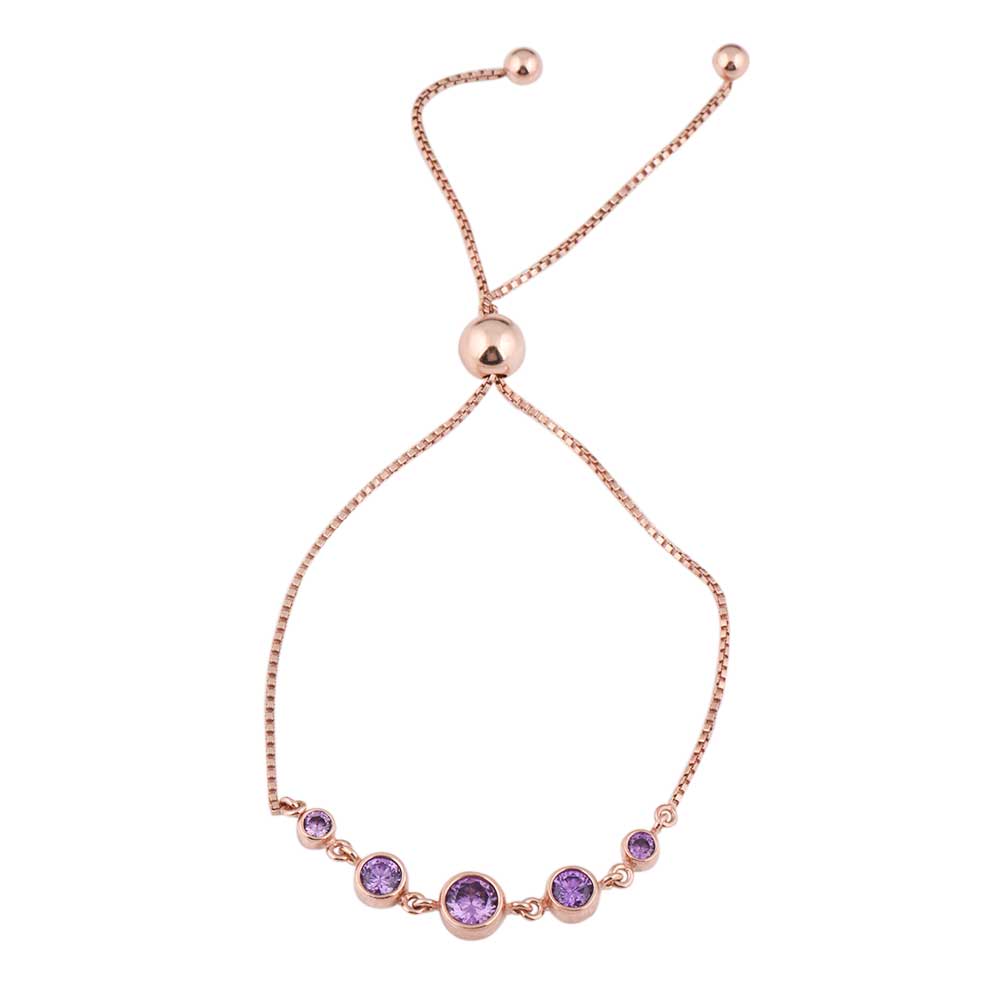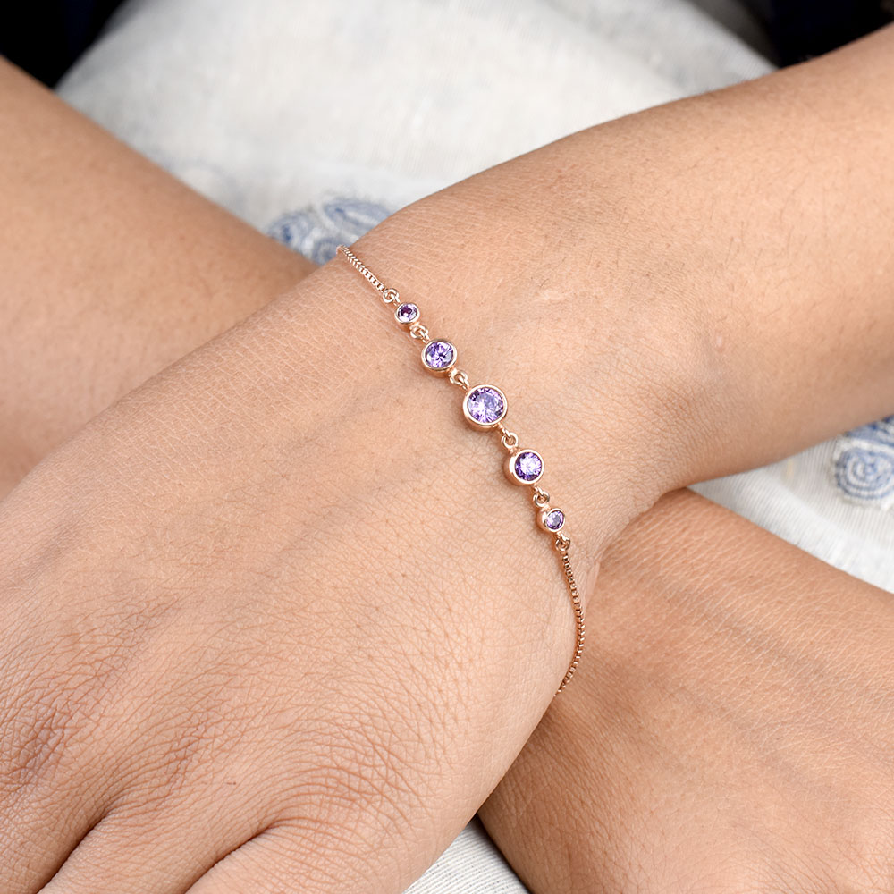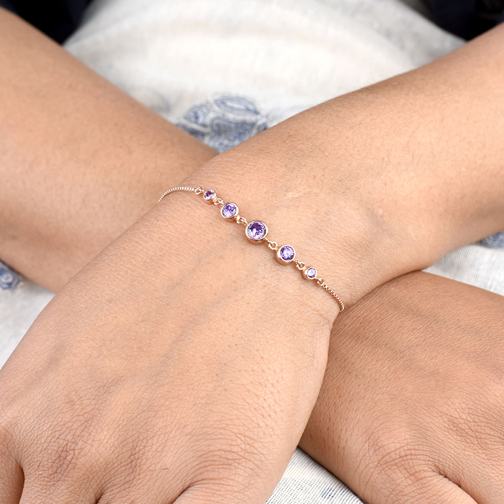 Elegant and romantic 92.5 Sterling Silver Bracelet decorated with round amethyst stones is the perfect accessory for that special evening, valentine day, anniversary, birthday or a small family get together. It comes with rose gold polish.