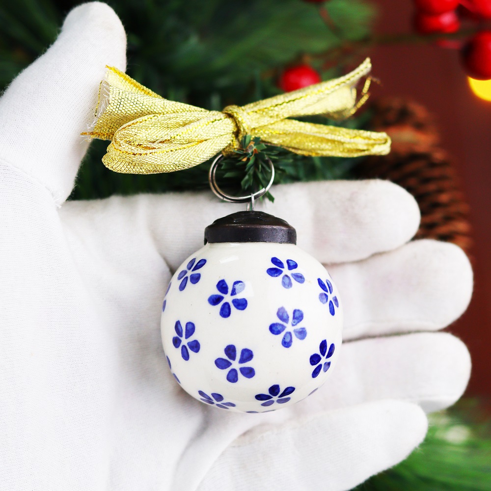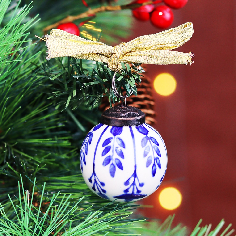 These round blue and white ceramic ornaments are ideal for creating a warm, inviting holiday atmosphere. Their classic color palette makes them suitable for traditional and modern decor, bringing a festive spirit to any home. The simplicity and elegance of these ornaments provide a perfect backdrop for other colorful or glitter decorations on your tree.