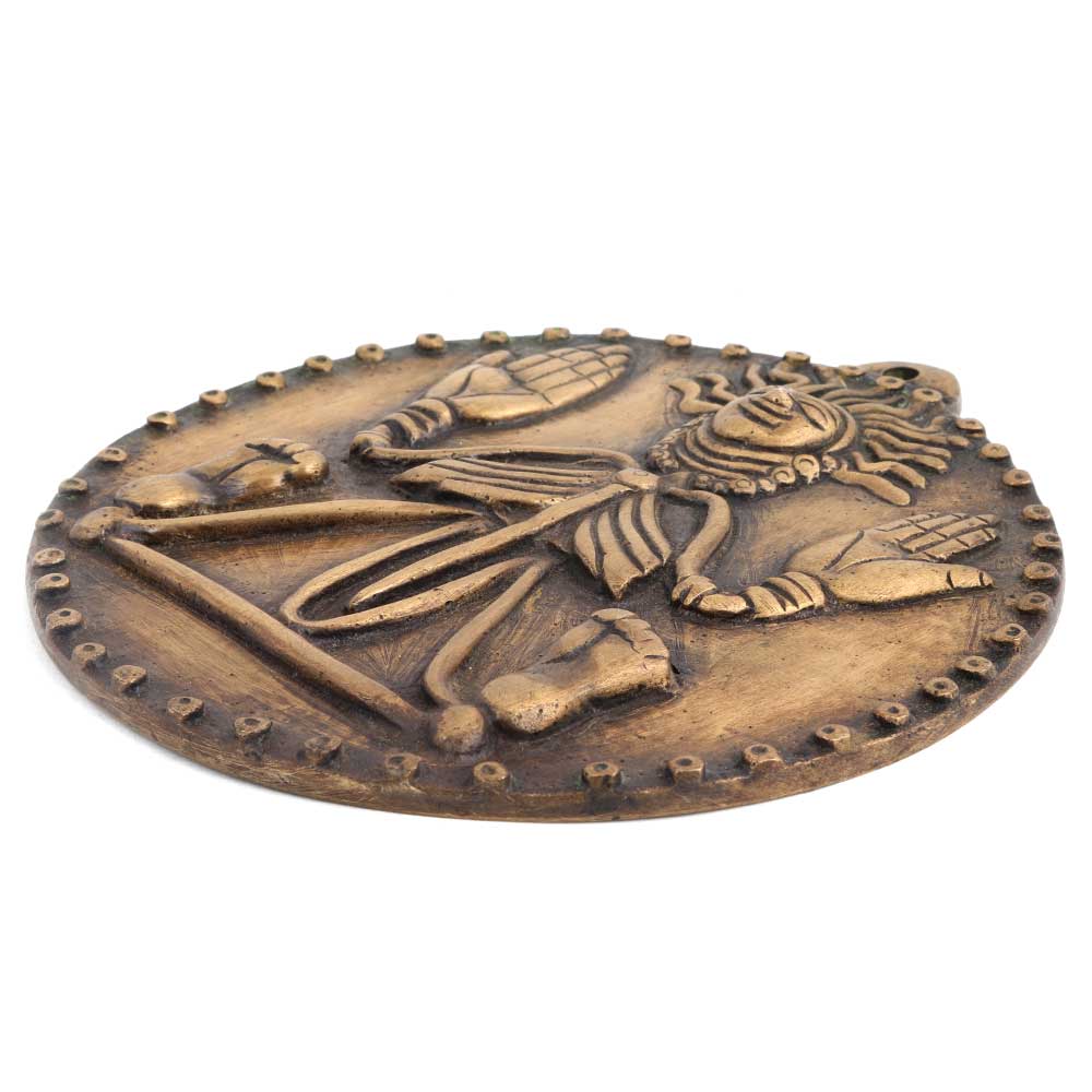 Handmade brass round Brass Plated engraved with Himalayan art with sun god with two blessing hands and legs and decorative border. This Brass Plate Serves as a Great Decorative Item a Gift or a Wall Hanging. Wedding gift, Diwali gift and house warming gift.