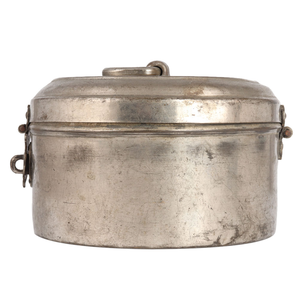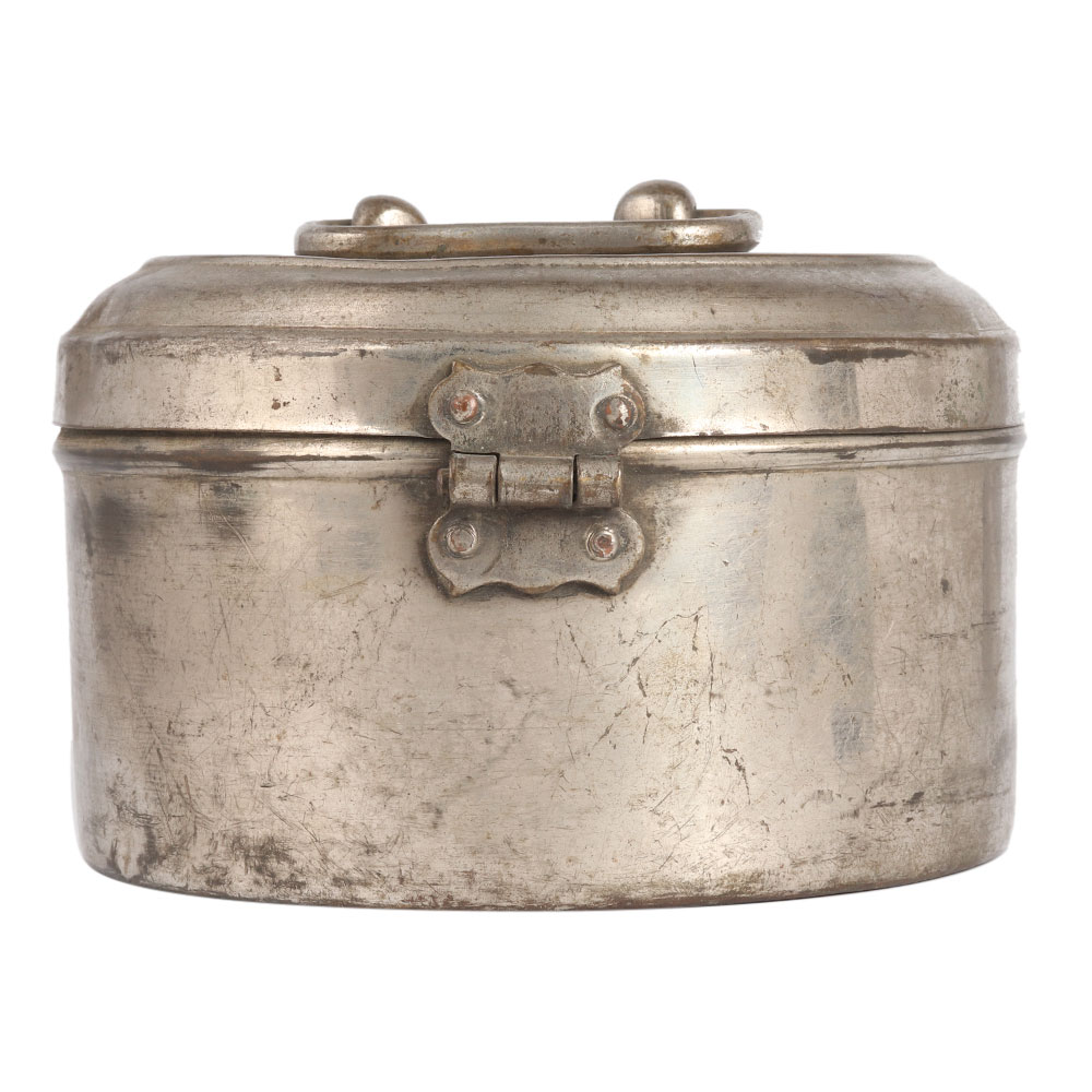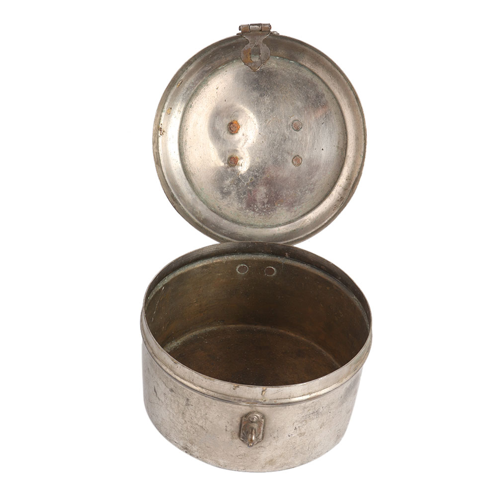 Vintage food box in grey colour. Hand carved from brass by skilled workers from South India using ancient methods. This food box is plated with nickel. It has a handle and a latch. This box has a round shape with a flat bottom to stay on the surface. It was used for transporting food while travelling. You can display it as a decorative element in your restaurant to give your restaurant a vintage style with this vintage food box or display it in your vintage collection.