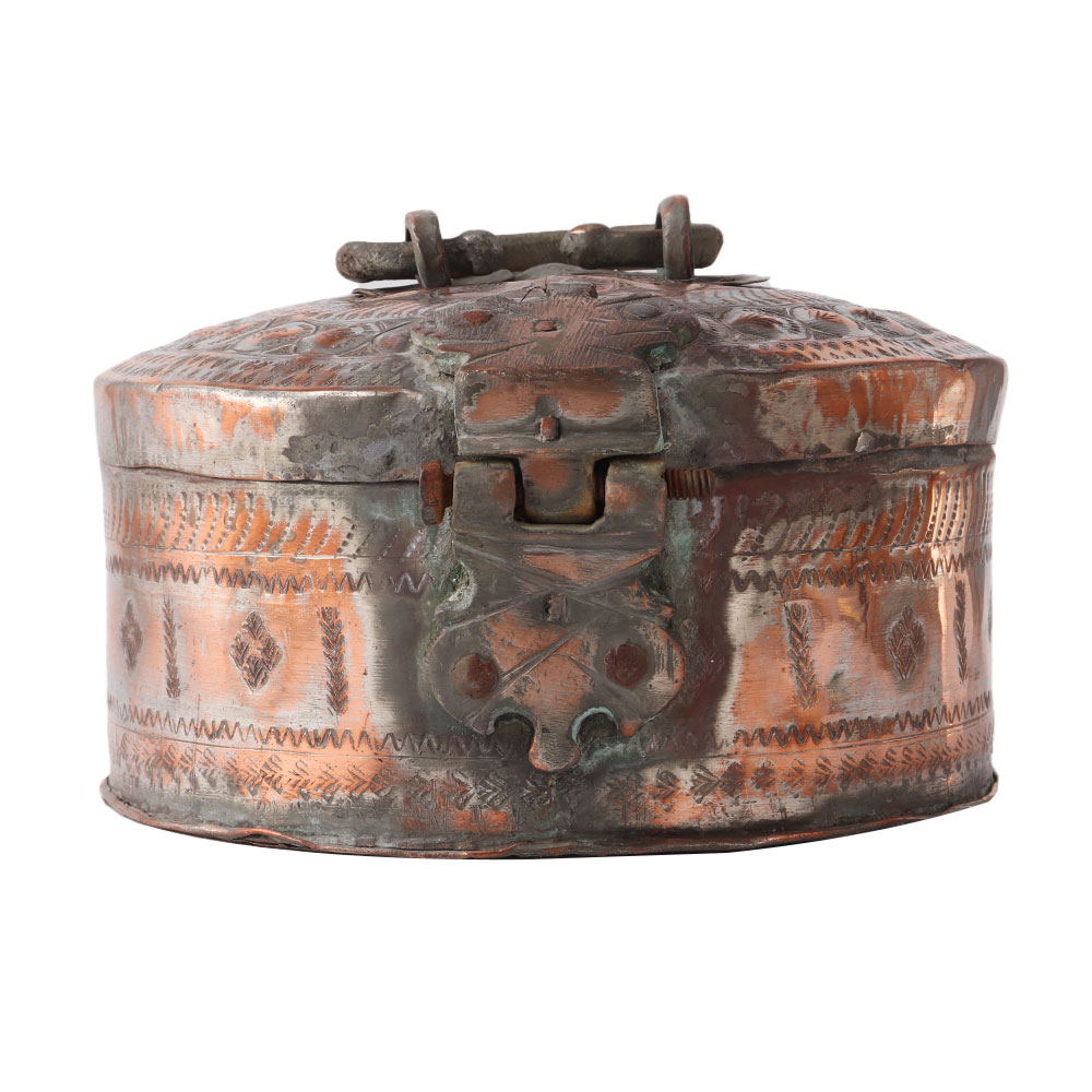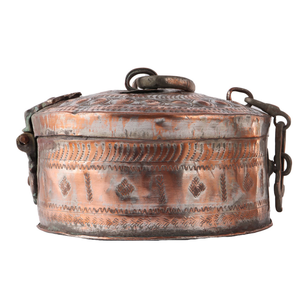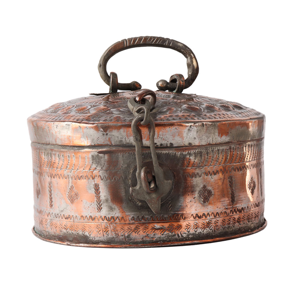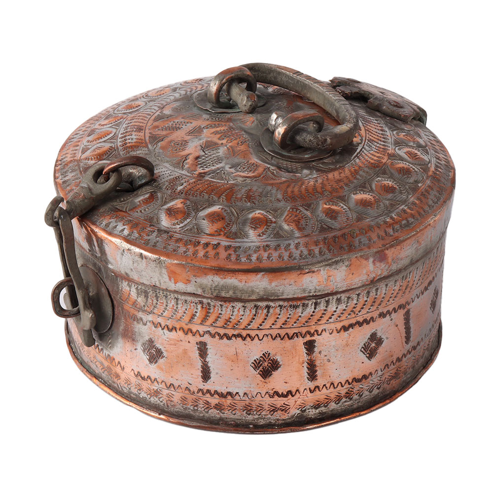 Handmade decorative round tinned copper Mughal Indian box with lid, latch, and handle. Tinned copper Indian vessel with floral and geometric designs that have been delicately and intricately hand-hammered. Beautiful dabba box with a lid handcrafted by skilled Northern Indian artisans. It could be a tea caddy or a treasure chest. Box with tinned copper lid and brass handle. Exquisite Indian Mughal conversation piece of museum quality with a lovely antique patina. ideal gift for family and friends Spices, nuts, trinkets, and other items can be stored. Table decoration at home, the office, school, and other establishments. Diwali, wedding, anniversary, and housewarming gifts are all possibilities.
