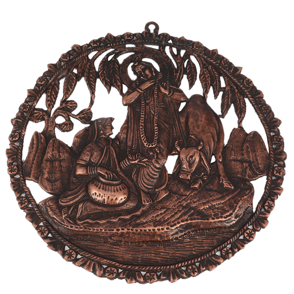 This is a lovely round copper wall hanging of Lord Krishna with his beloved Radha and a cow. Its special design will undoubtedly enhance the elegance of your home. It is an exceptional gift for your loved ones.