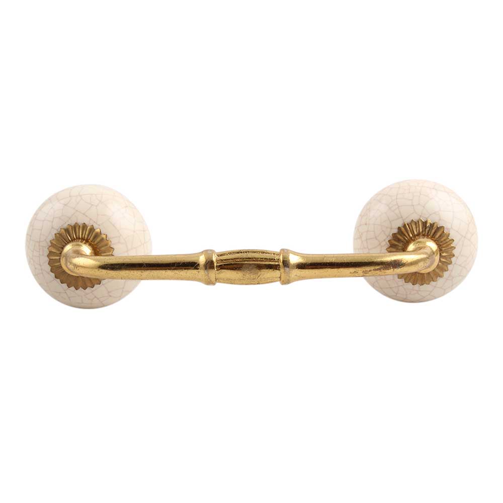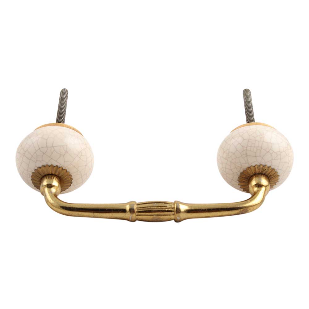 This round crackle ceramic bridge handle showcases a unique, textured surface with a charming crackle finish. Its understated yet sophisticated design makes it a perfect addition to any furniture piece, blending style with functionality.