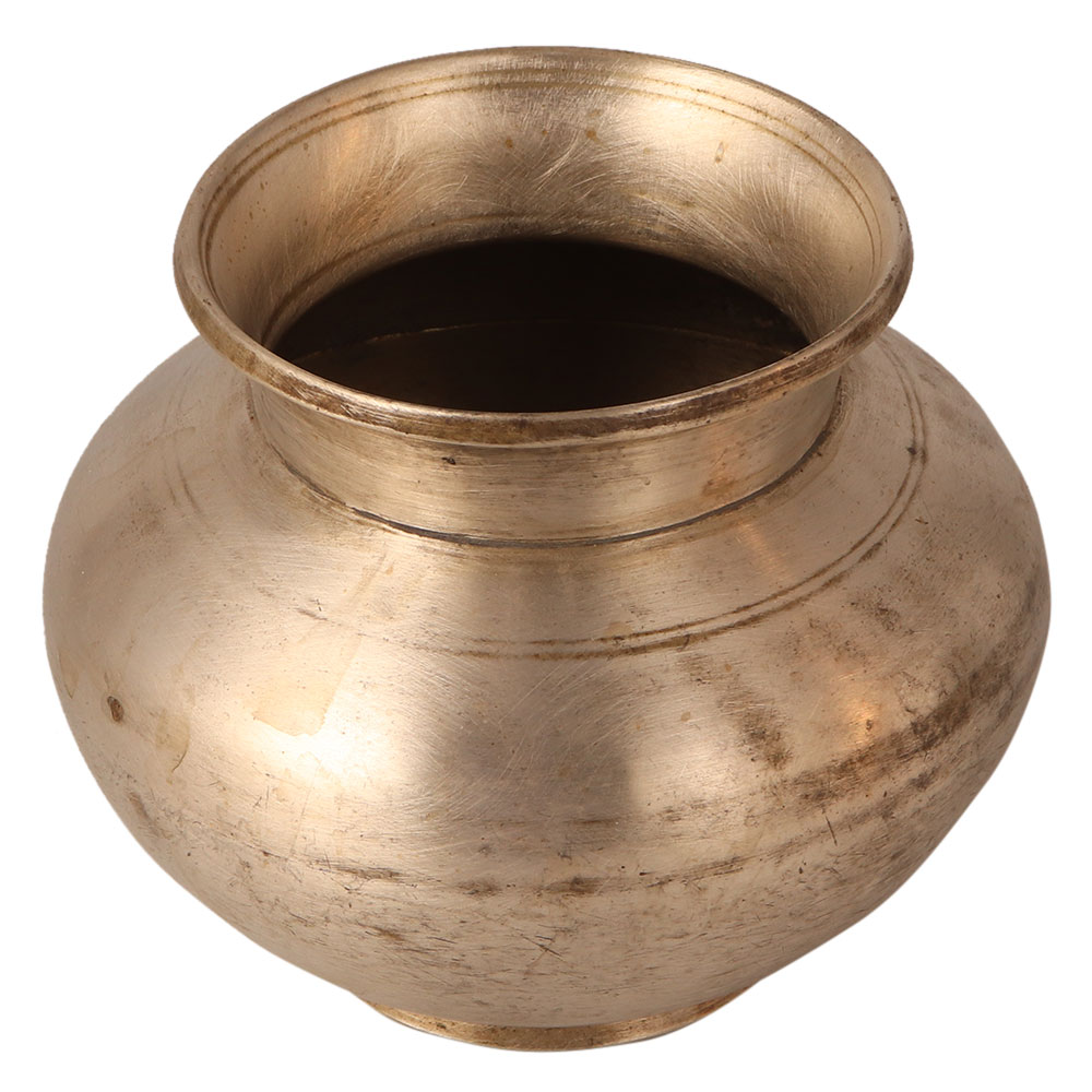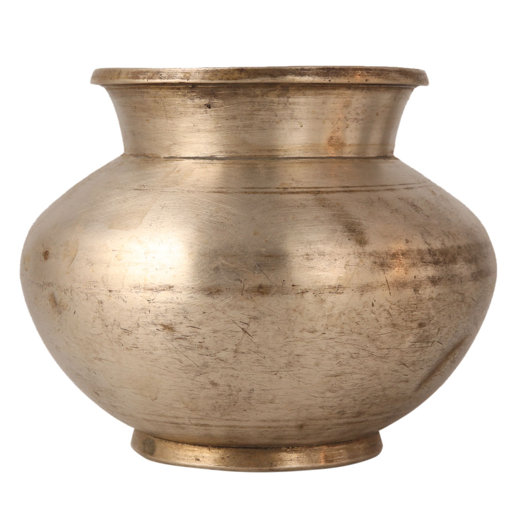 A round water pot carved from a white metal alloy. It has a round shape with simple design for home and office decoration. It can be used as a flower pot for stage decoration or spiritual events. You can use it as a storage for holy water at home to spread positive energy in the room.