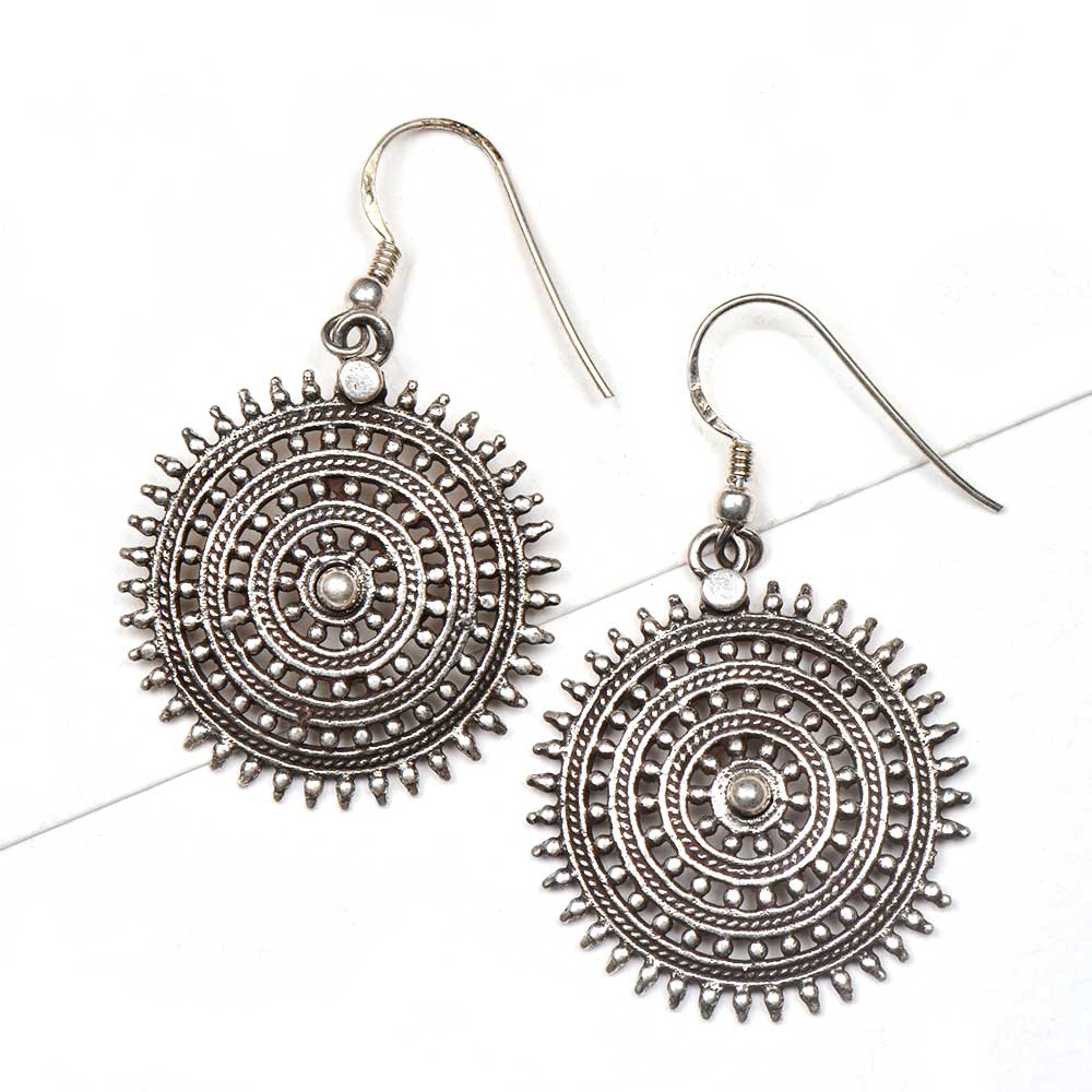 Round 92.5 Sterling silver earrings with filigree traditional design is made by the tribal craftsmen of India. Gift it to your near and dear ones on Diwali , Christmas, wedding, birthday , as souvenir. You can match it with your dresses, suits, traditional were as well as western wear.