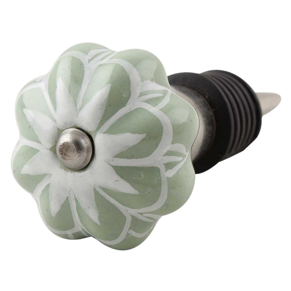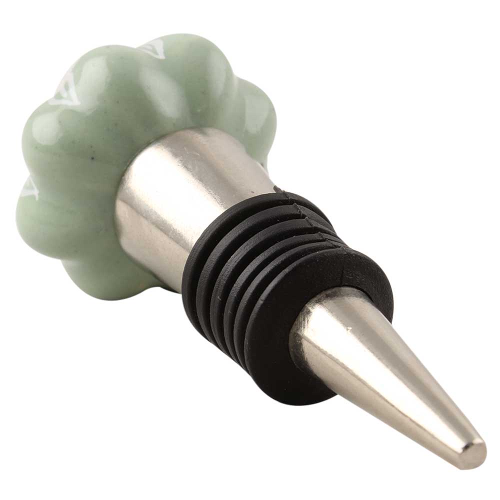Sage Green Flower Medium Ceramic Melon Wine Stopper. Zinc Alloy Wine Bottle Stopper with Attractive Jute Bag Packaging.