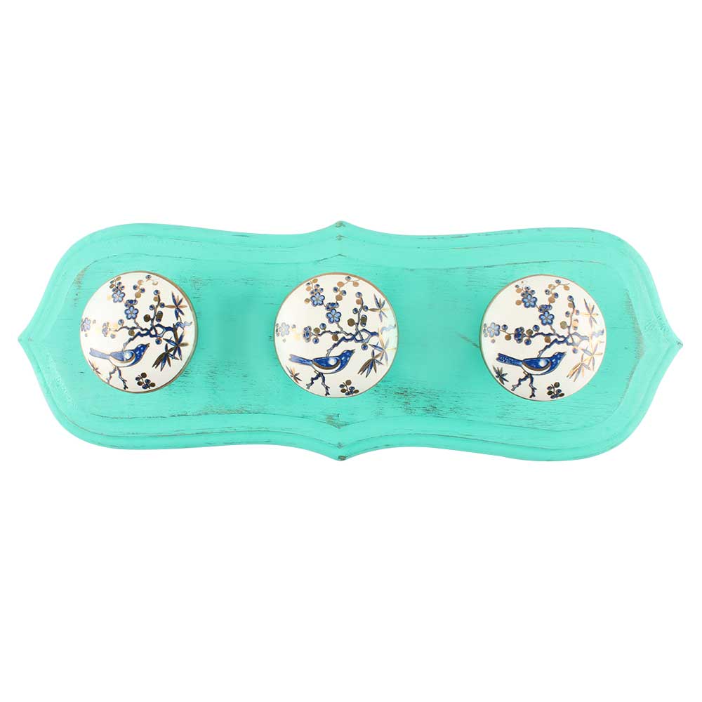 Sage Green With Blue Bird Golden Berry Ceramic Wooden Hook. A Perfect Complement to the Soft Tone of the Wood are these White Traditional Hat and Coat Hook Made of Genuine Porcelain. It can be use to Hang Jewellery, Leashes, Towels, Scarves, Light Weight Sweaters, Caps etc.