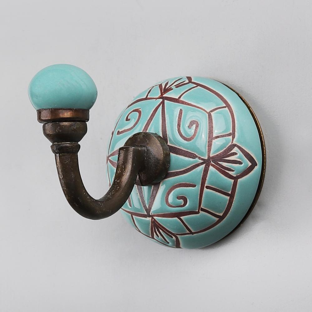 Sea Green And Brown Etched Ceramic Wall Hook. When Put on Wall or Cabinet It is An Art in Itself. This Hook is Strong Enough to Hold Your Cloths, Keys, Tea Cups, Coffee Mugs, Hand Towels etc.