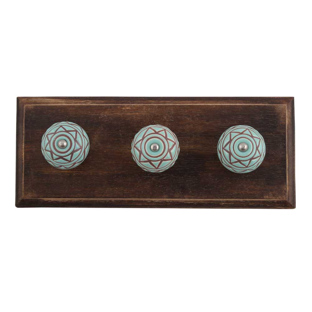 Sea Green Base Brown Pattern Etched Ceramic Wooden Hook. A Perfect Complement to the Soft Tone of the Wood are these White Traditional Hat & Coat Hook Made of Genuine Porcelain and Brass. It can be use to Hang Jewellery, Leashes, Towels, Scarves, Light Weight Sweaters, Caps Etc.