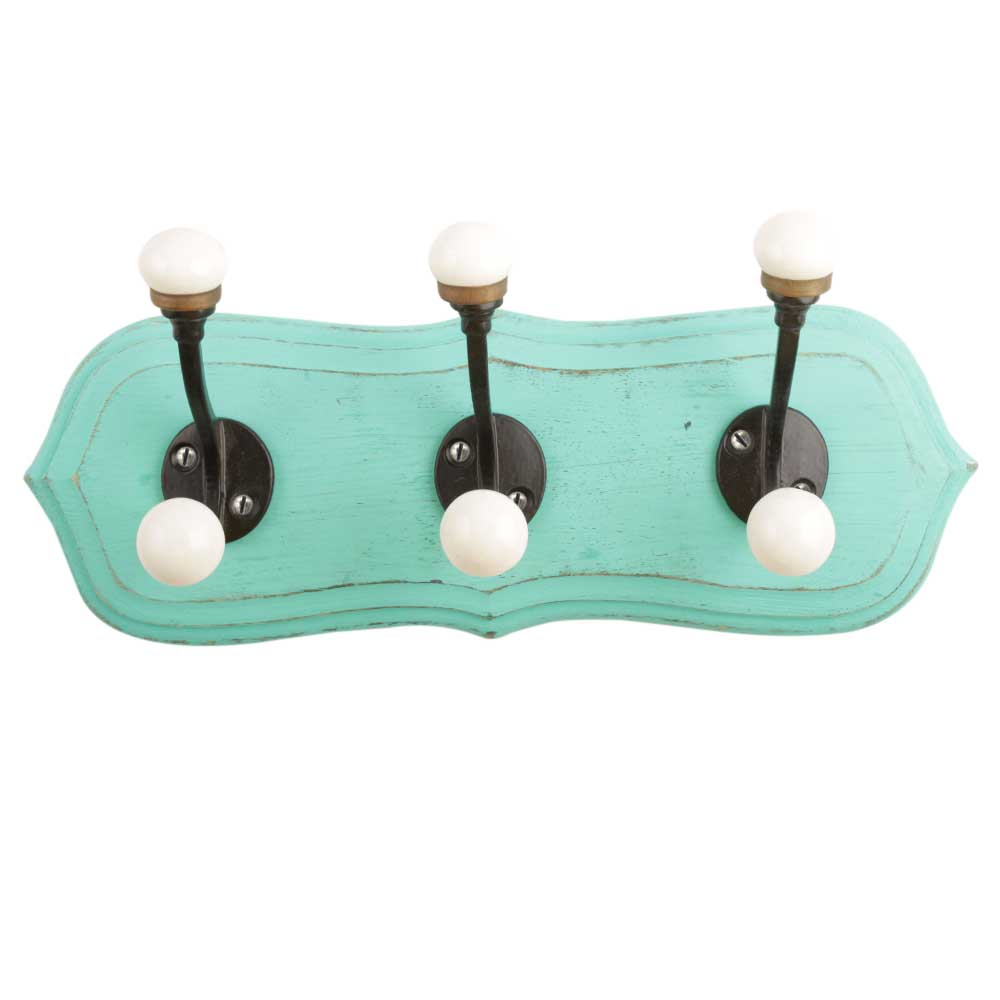 Sea Green Black Double Loop Ceramic Iron Wooden Hooks. A Perfect Complement to the Soft Tone of the Wood are these White Traditional Hat & Coat Hook Made of Genuine Porcelain and Brass. It can be use to Hang Jewellery, Leashes, Towels, Scarves, Light Weight Sweaters, Caps Etc.