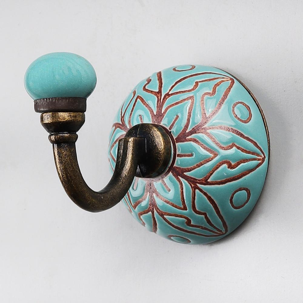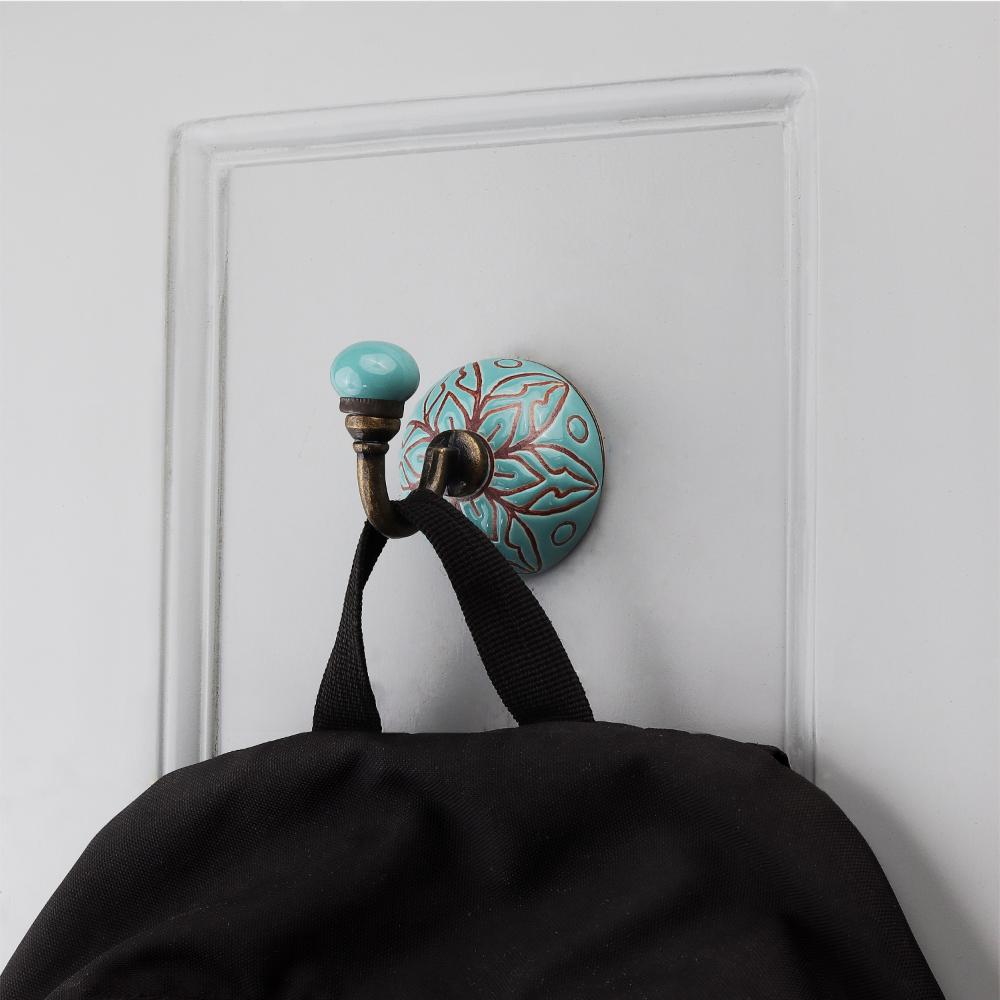 Sea Green Brown Amarylis Etched Ceramic Wall Hook. When Put on Wall or Cabinet It is An Art in Itself. This Hook is Strong Enough to Hold Your Cloths, Keys, Tea Cups, Coffee Mugs, Hand Towels etc.