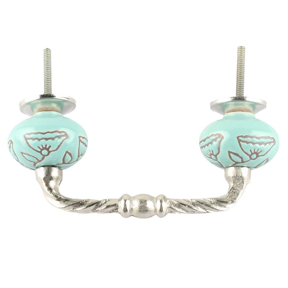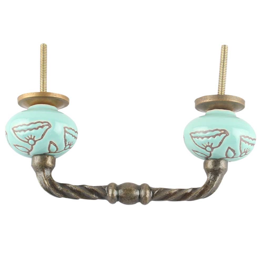 Sea Green Calla Lily Brown Etched Ceramic Cut Bridge Handle. Ideal for Drawer, Dresser, Cabinet, Wardrobe, Cupboard and Almirah etc.