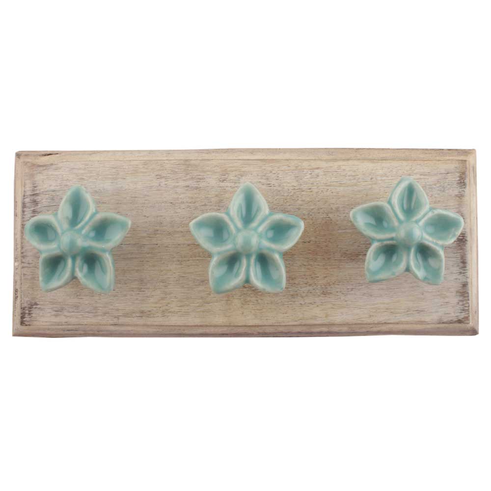 Sea Green Ceramic Flower Wooden Hooks. A Perfect Complement to the Soft Tone of the Wood are these White Traditional Hat and Coat Hook Made of Genuine Porcelain and Brass. It can be used to Hang Jewelry, Leashes, Towels, Scarves, Light Weight Sweaters, Caps etc.