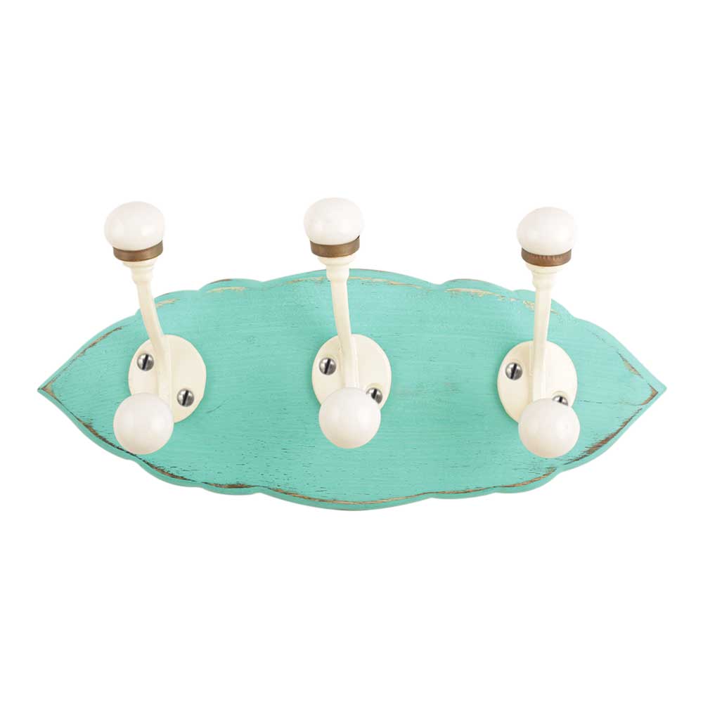 Sea Green Cream Double Loop Ceramic Iron Wooden Hooks. A Perfect Complement to the Soft Tone of the Wood are these White Traditional Hat & Coat Hook Made of Genuine Porcelain and Brass. It can be use to Hang Jewellery, Leashes, Towels, Scarves, Light Weight Sweaters, Caps Etc.