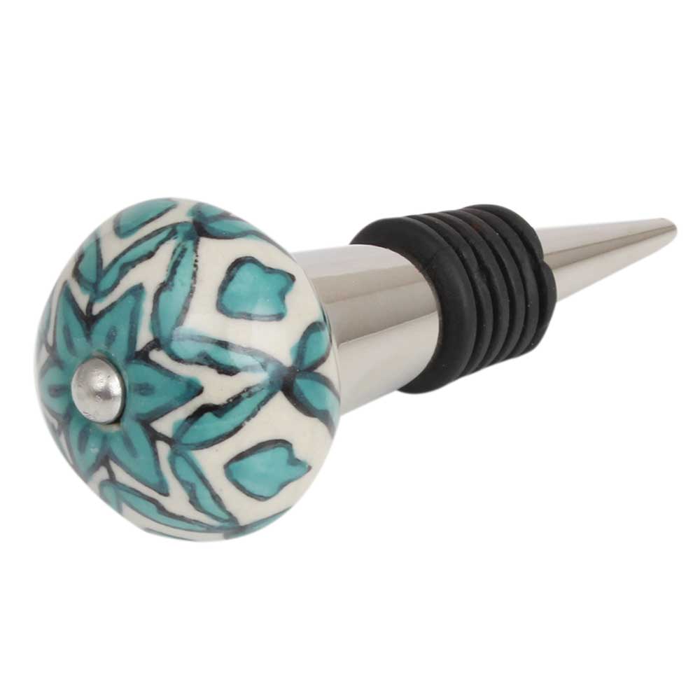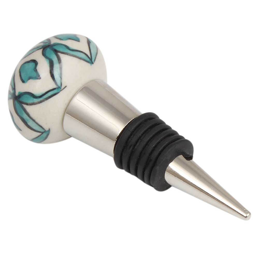Sea Green Flower Ceramic Wine Bottle Stopper. Zinc Alloy Wine Bottle Stopper with Attractive Jute Bag Packaging.
