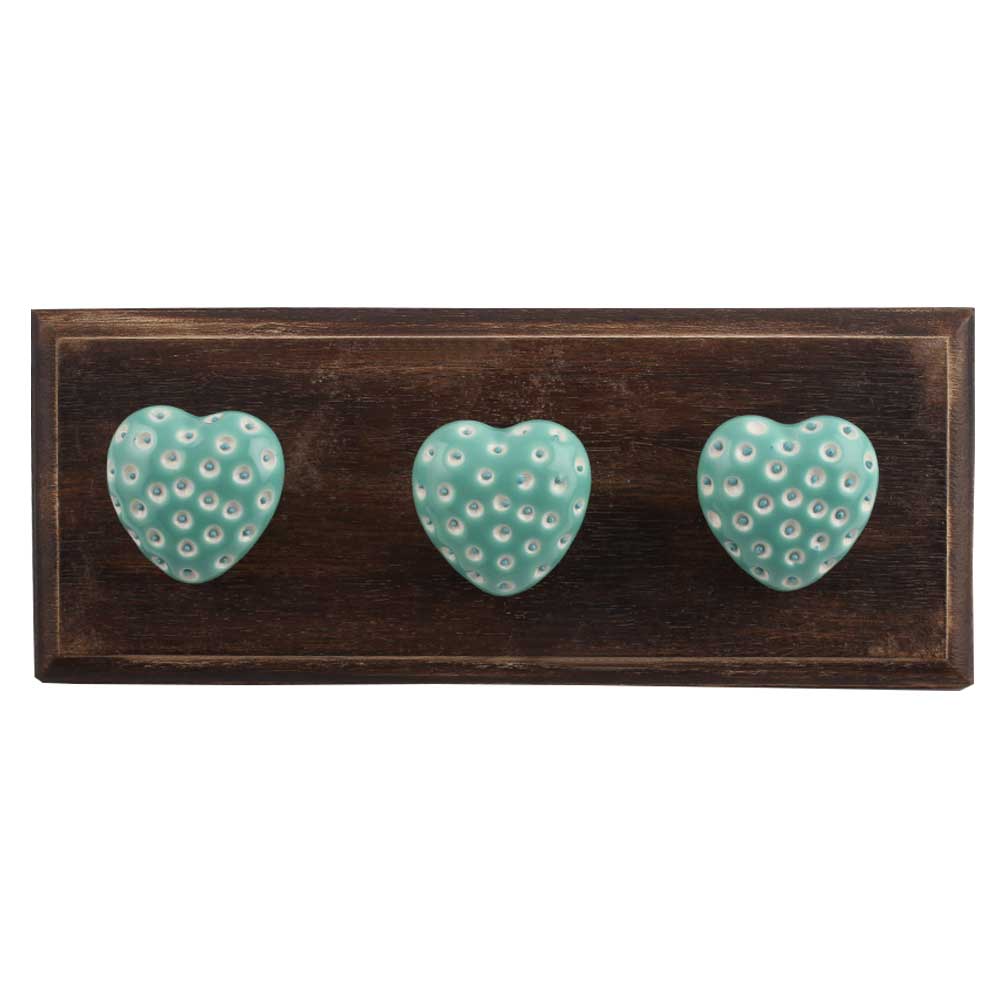 Sea Green Heart Etched Ceramic Wooden Hook. A Perfect Complement to the Soft Tone of the Wood are these White Traditional Hat &Amp; Coat Hook Made of Genuine Porcelain and Brass. It can be use to Hang Jewellery, Leashes, Towels, Scarves, Light Weight Sweaters, Caps Etc.