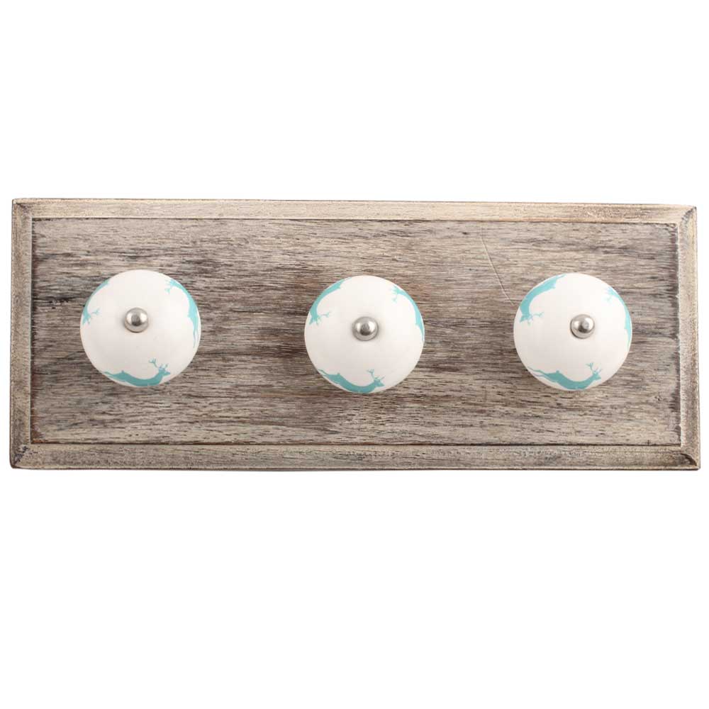 Sea Green Running Rein Deer Pattern Ceramic Wooden Hook. A Perfect Complement to the Soft Tone of the Wood are these White Traditional Hat & Coat Hook Made of Genuine Porcelain and Brass. It can be use to Hang Jewellery, Leashes, Towels, Scarves, Light Weight Sweaters, Caps Etc.