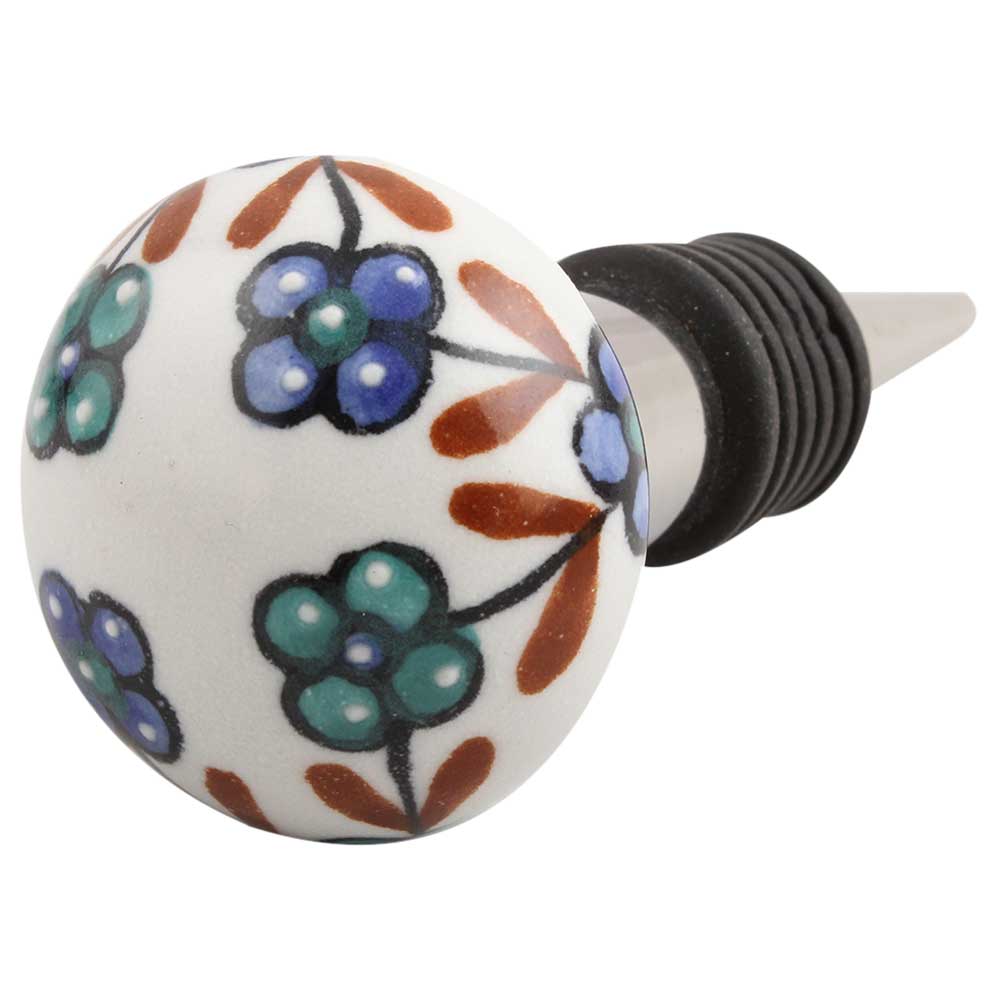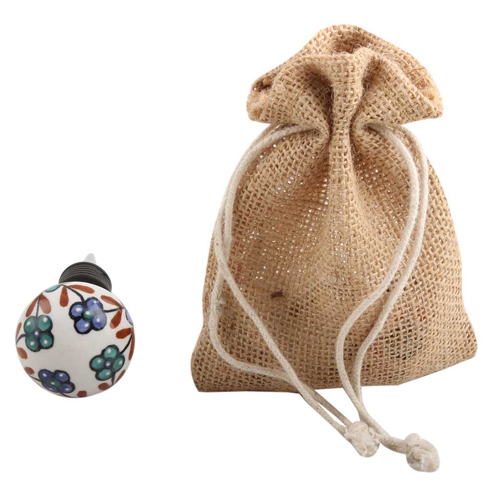 Sea Green Slate Blue Tiny Flower Ceramic Wine Stopper. Zinc Alloy Wine Bottle Stopper with Attractive Jute Bag Packaging.