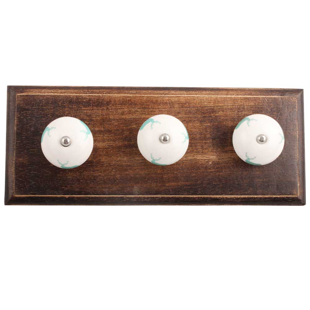 Sea Green Standing Rein Deer Pattern Ceramic Wooden Hook. A Perfect Complement to the Soft Tone of the Wood are these White Traditional Hat & Coat Hook Made of Genuine Porcelain and Brass. It can be use to Hang Jewellery, Leashes, Towels, Scarves, Light Weight Sweaters, Caps Etc.