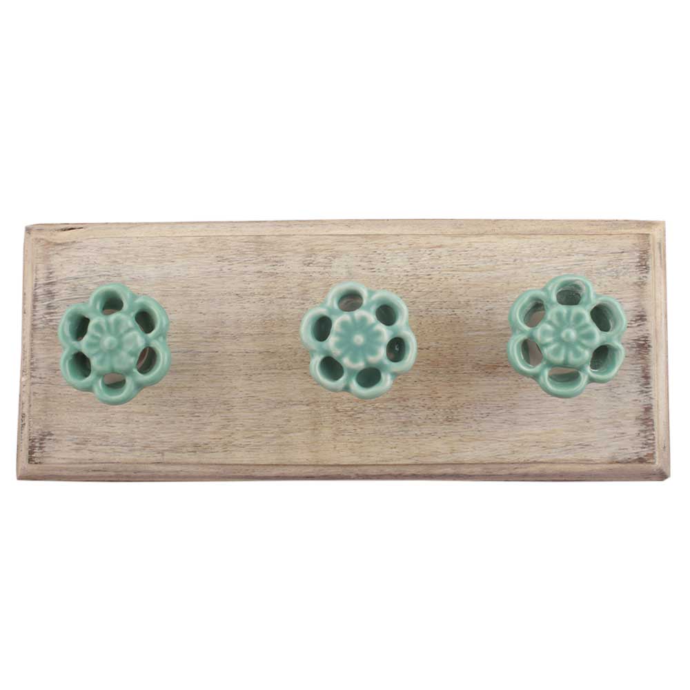 Sea Green Tiny Flower Ceramic Wooden Hooks Online. A Perfect Complement to the Soft Tone of the Wood are these White Traditional Hat and Coat Hook Made of Genuine Porcelain and Brass. It can be used to Hang Jewelry, Leashes, Towels, Scarves, Light Weight Sweaters, Caps etc.