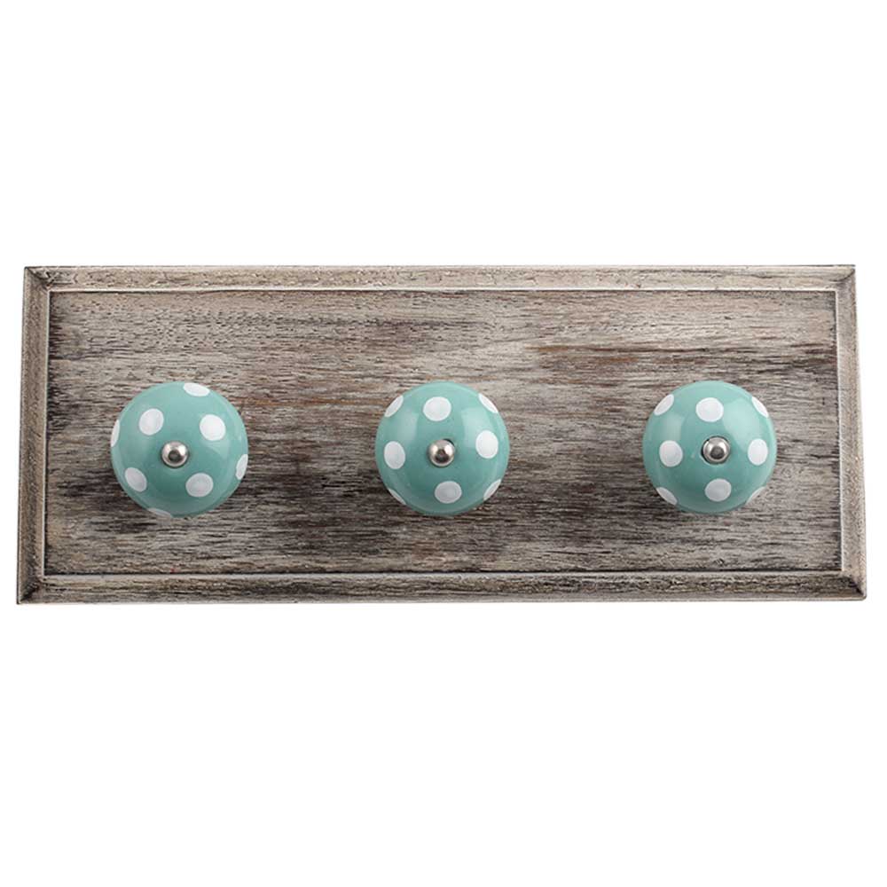 Sea Green White Dot Wooden Hooks . A Perfect Complement to the Soft Tone of the Wood are these White Traditional Hat &Amp; Coat Hook Made of Genuine Porcelain and Brass. It can be use to Hang Jewellery, Leashes, Towels, Scarves, Light Weight Sweaters, Caps Etc.