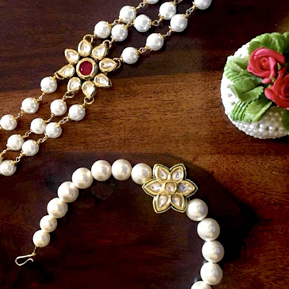 Rakhi + Lumba set - Premium kundan center piece with shell pearls.