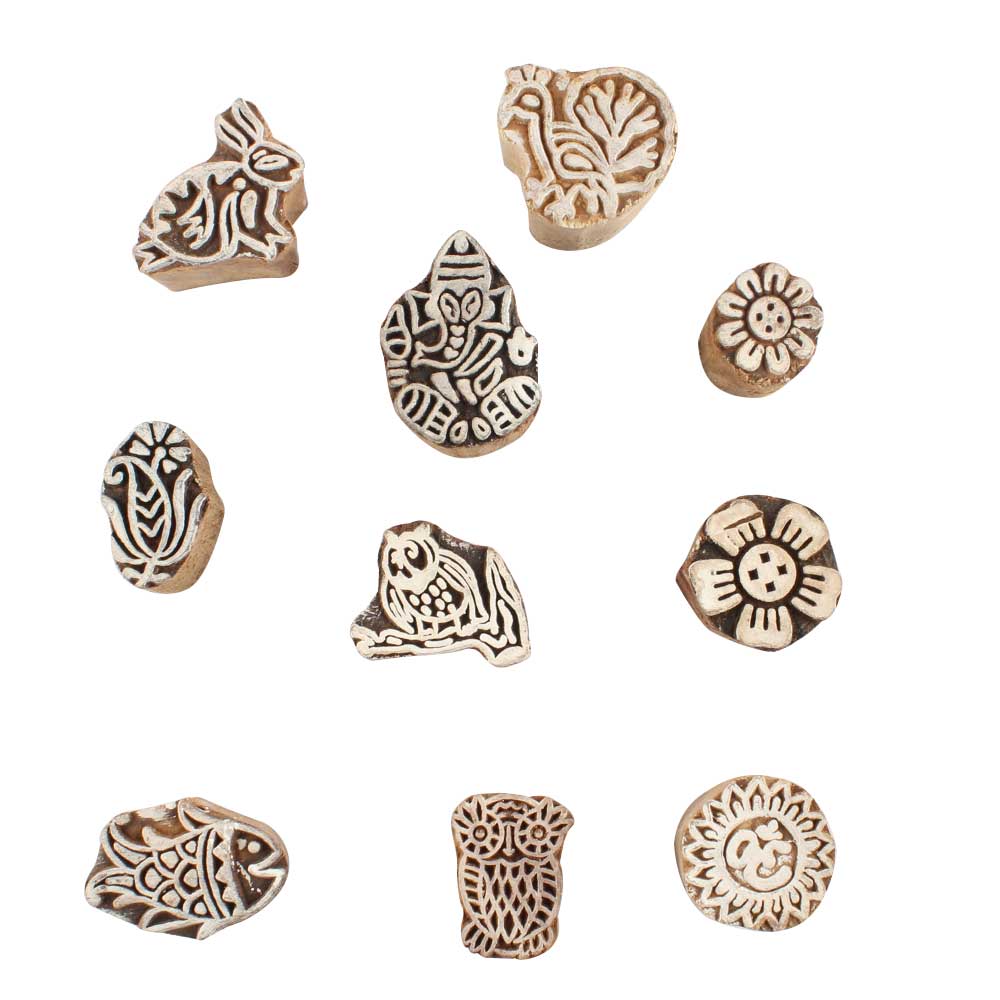 Set of 10 Piece New Mix Wooden Printing Block. Ideal for use on Fabric, Paper, Canvas, etc. These Blocks can be use to Print with Oil Colors, Fabric Colors, Water Colors, Acrylic Colors and Vegetable Colors.