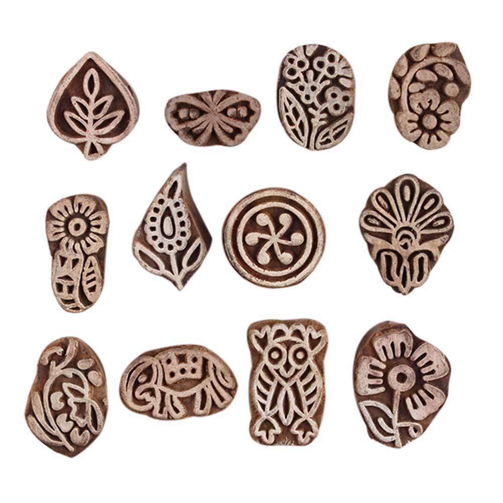 Set of 12 Piece New Mix Wooden Printing Block. Ideal for Using on Fabric, Paper, Canvas, etc. These Blocks can be use to Print with Oil Colors, Fabric Colors, Water Colors, Acrylic Colors and Vegetable Colors.
