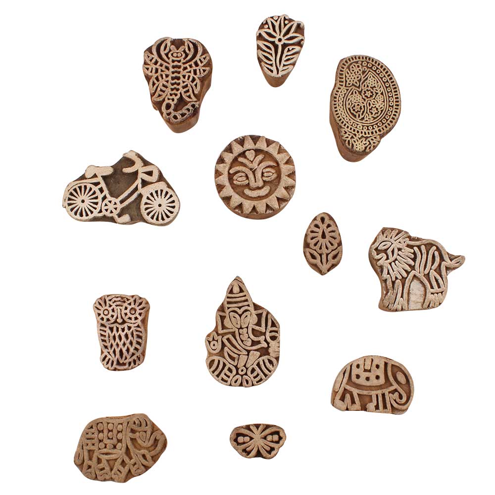 Set of 12 Piece New Mix Wooden Printing Blocks. Ideal for use on Fabric, Paper, Canvas, etc. These Blocks can be use to Print with Oil Colors, Fabric Colors, Water Colors, Acrylic Colors and Vegetable Colors.