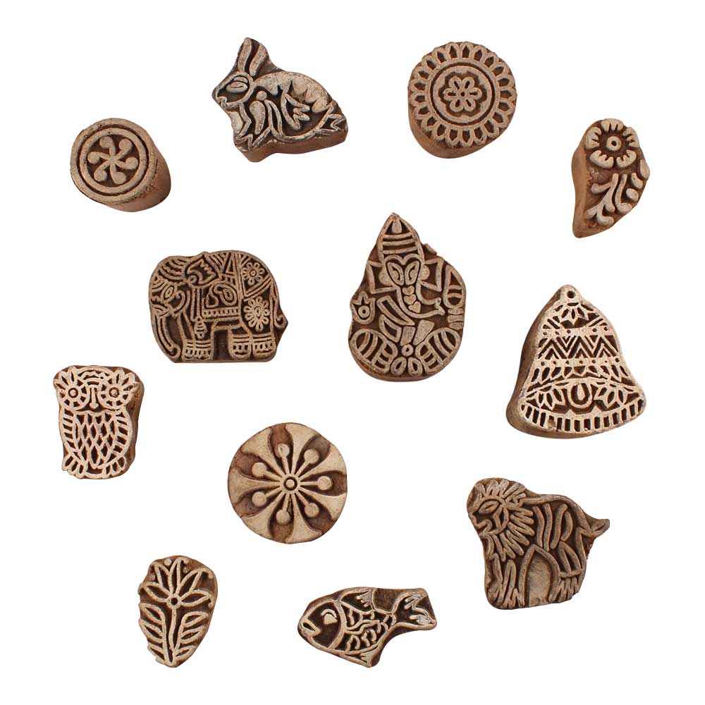 Set of 12 Piece New Mix Wooden Printing Blocks. Ideal for use on Fabric, Paper, Canvas, etc. These Blocks can be use to Print with Oil Colors, Fabric Colors, Water Colors, Acrylic Colors and Vegetable Colors.