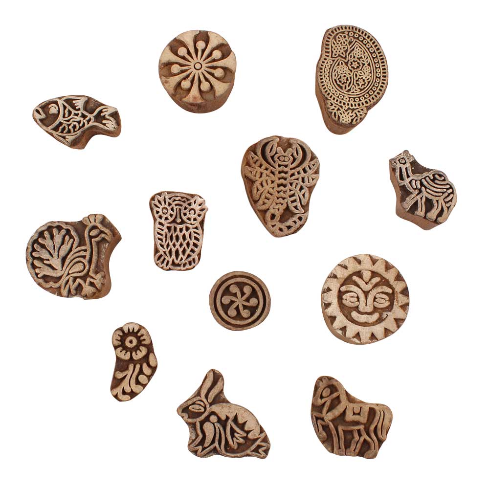 Set of 12 Piece New Mix Wooden Printing Blocks. Ideal for use on Fabric, Paper, Canvas, etc. These Blocks can be use to Print with Oil Colors, Fabric Colors, Water Colors, Acrylic Colors and Vegetable Colors.