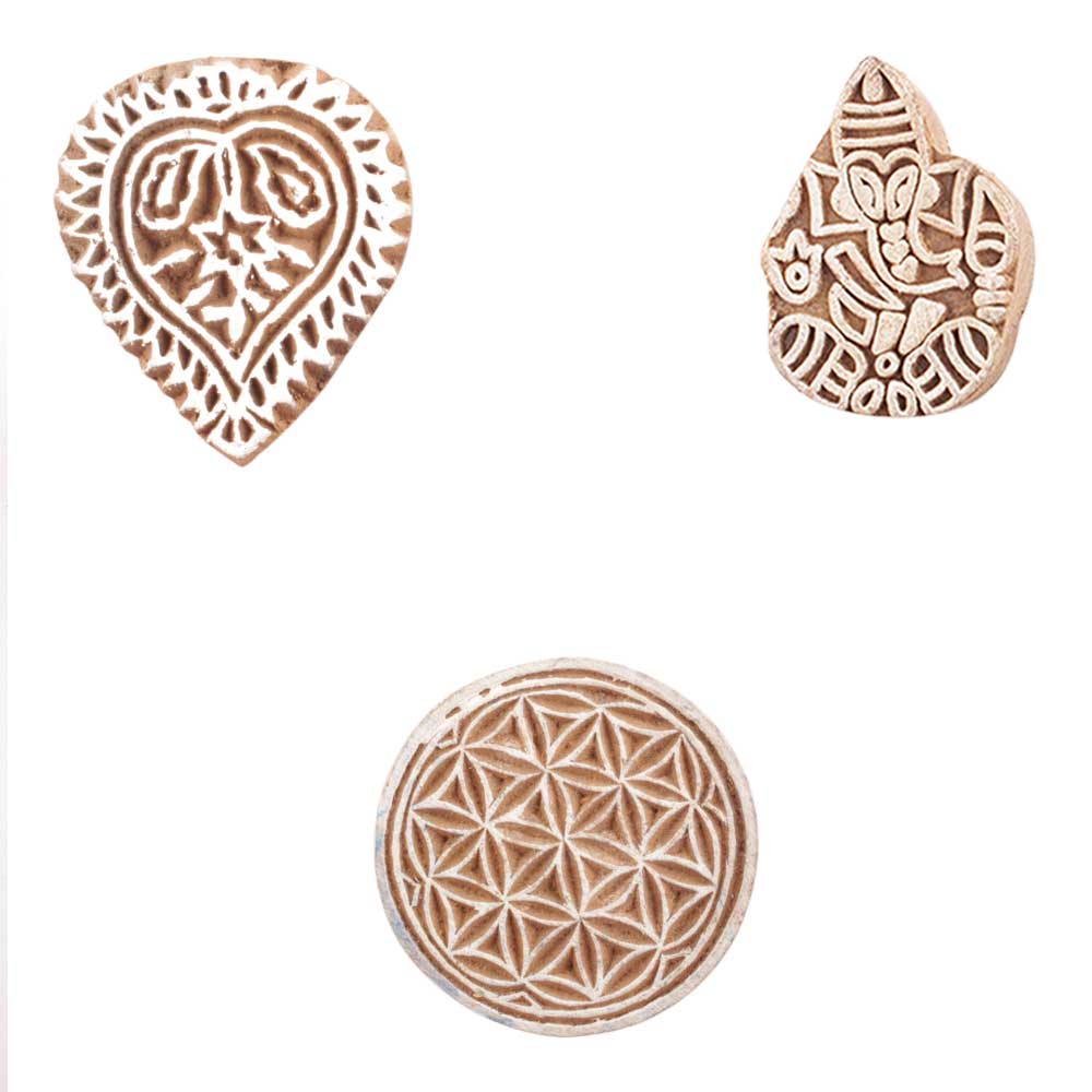 Set of 3 Piece New Mix Wooden Printing Block. Ideal for use on Fabric, Paper, Canvas, etc. These Blocks can be use to Print with Oil Colors, Fabric Colors, Water Colors, Acrylic Colors and Vegetable Colors.