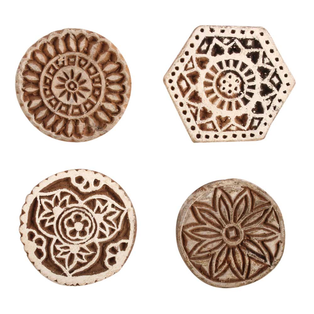Set of 4 Piece New Mix Wooden Printing Block. Ideal for use on Fabric, Paper, Canvas, etc. These Blocks can be use to Print with Oil Colors, Fabric Colors, Water Colors, Acrylic Colors and Vegetable Colors.