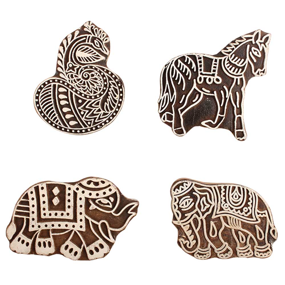 Set of 4 Piece New Mix Wooden Printing Block. Ideal for use on Fabric, Paper, Canvas, etc. These Blocks can be use to Print with Oil Colors, Fabric Colors, Water Colors, Acrylic Colors and Vegetable Colors.