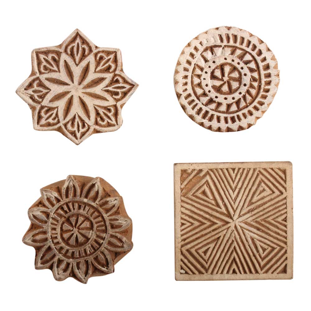 Set of 4 Piece New Mix Wooden Printing Block. Ideal for use on Fabric, Paper, Canvas, etc. These Blocks can be use to Print with Oil Colors, Fabric Colors, Water Colors, Acrylic Colors and Vegetable Colors.