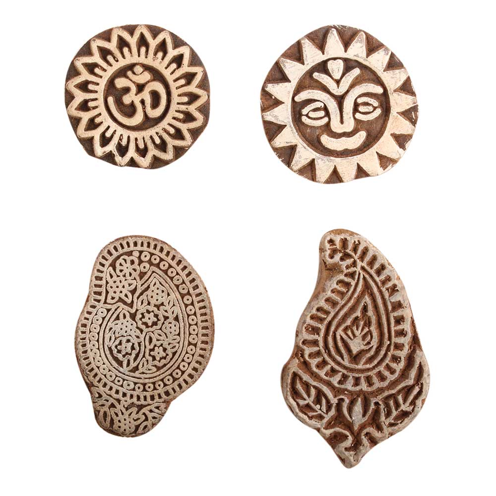 Set of 4 Piece New Mix Wooden Printing Block. Ideal for use on Fabric, Paper, Canvas, etc. These Blocks can be use to Print with Oil Colors, Fabric Colors, Water Colors, Acrylic Colors and Vegetable Colors.