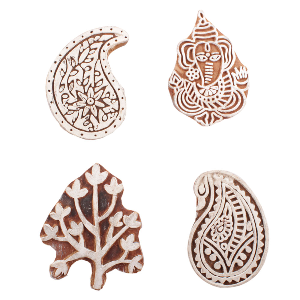Set of 4 Piece New Mix Wooden Printing Block. Ideal for use on Fabric, Paper, Canvas, etc. These Blocks can be use to Print with Oil Colors, Fabric Colors, Water Colors, Acrylic Colors and Vegetable Colors.