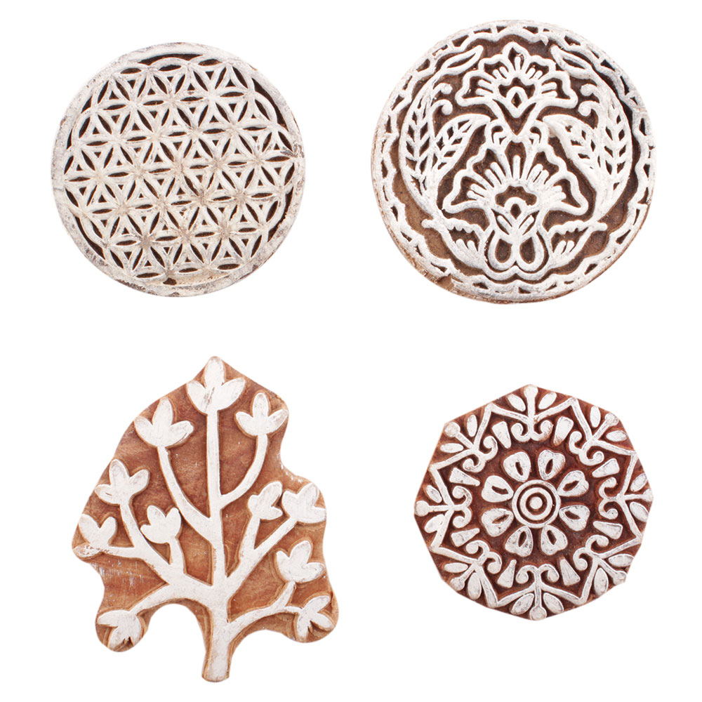 Set of 4 Piece New Mix Wooden Printing Block. Ideal for use on Fabric, Paper, Canvas, etc. These Blocks can be use to Print with Oil Colors, Fabric Colors, Water Colors, Acrylic Colors and Vegetable Colors.