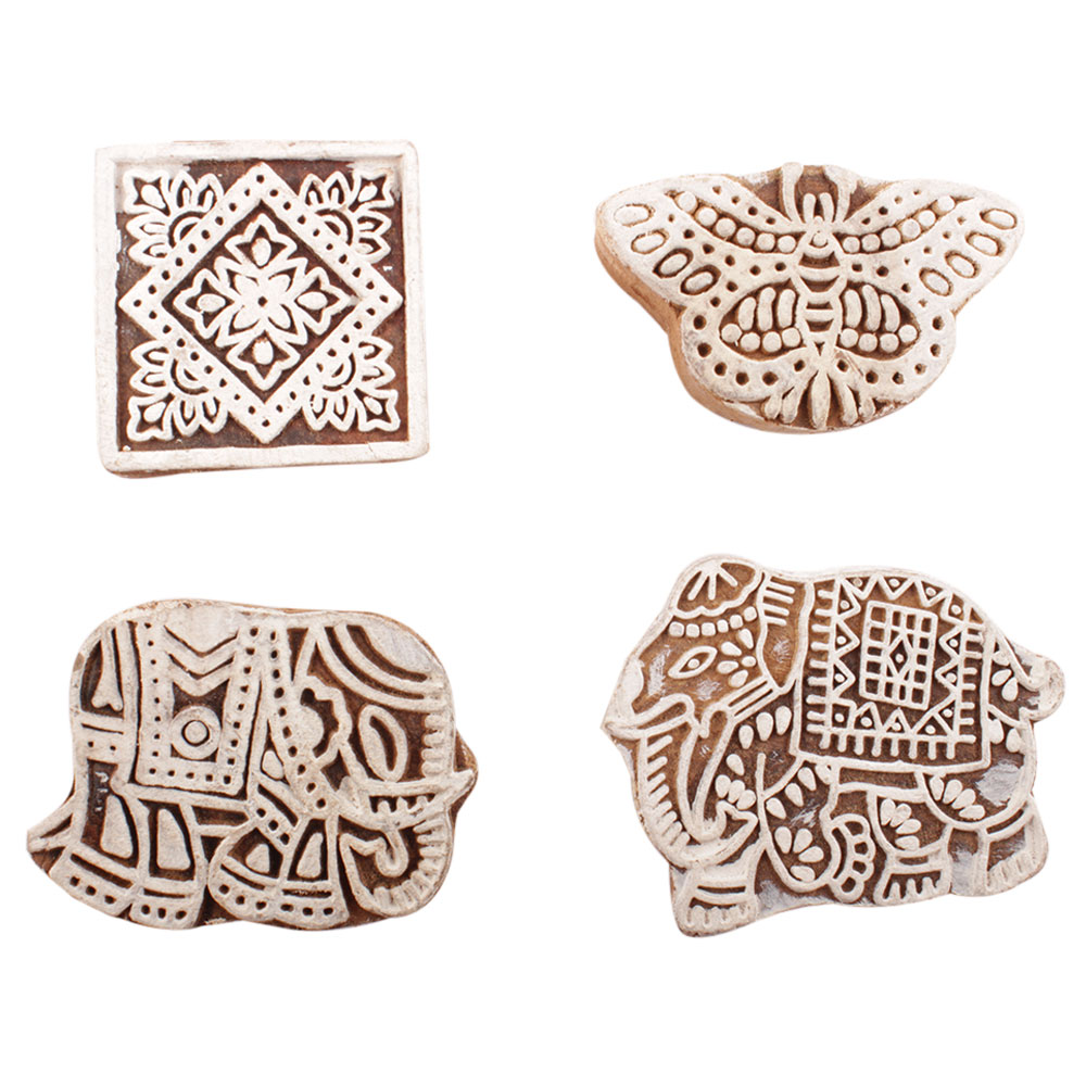 Set of 4 Piece New Mix Wooden Printing Block. Ideal for use on Fabric, Paper, Canvas, etc. These Blocks can be use to Print with Oil Colors, Fabric Colors, Water Colors, Acrylic Colors and Vegetable Colors.