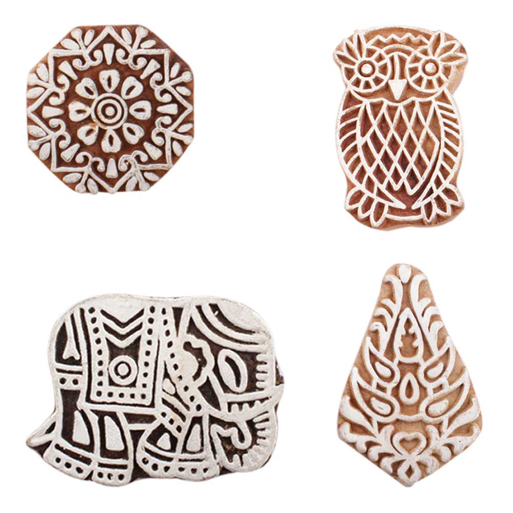 Set of 4 Piece New Mix Wooden Printing Block. Ideal for use on Fabric, Paper, Canvas, etc. These Blocks can be use to Print with Oil Colors, Fabric Colors, Water Colors, Acrylic Colors and Vegetable Colors.