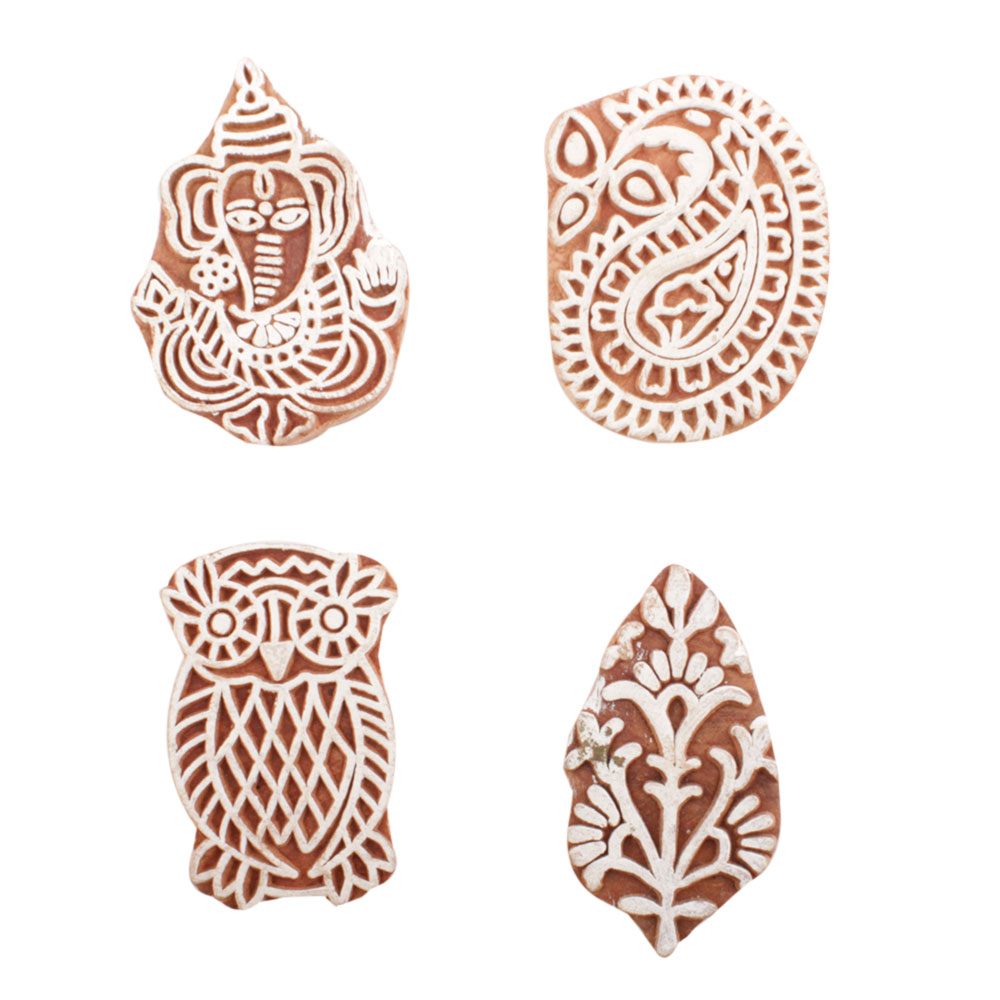 Set of 4 Piece New Mix Wooden Printing Block. Ideal for use on Fabric, Paper, Canvas, etc. These Blocks can be use to Print with Oil Colors, Fabric Colors, Water Colors, Acrylic Colors and Vegetable Colors.