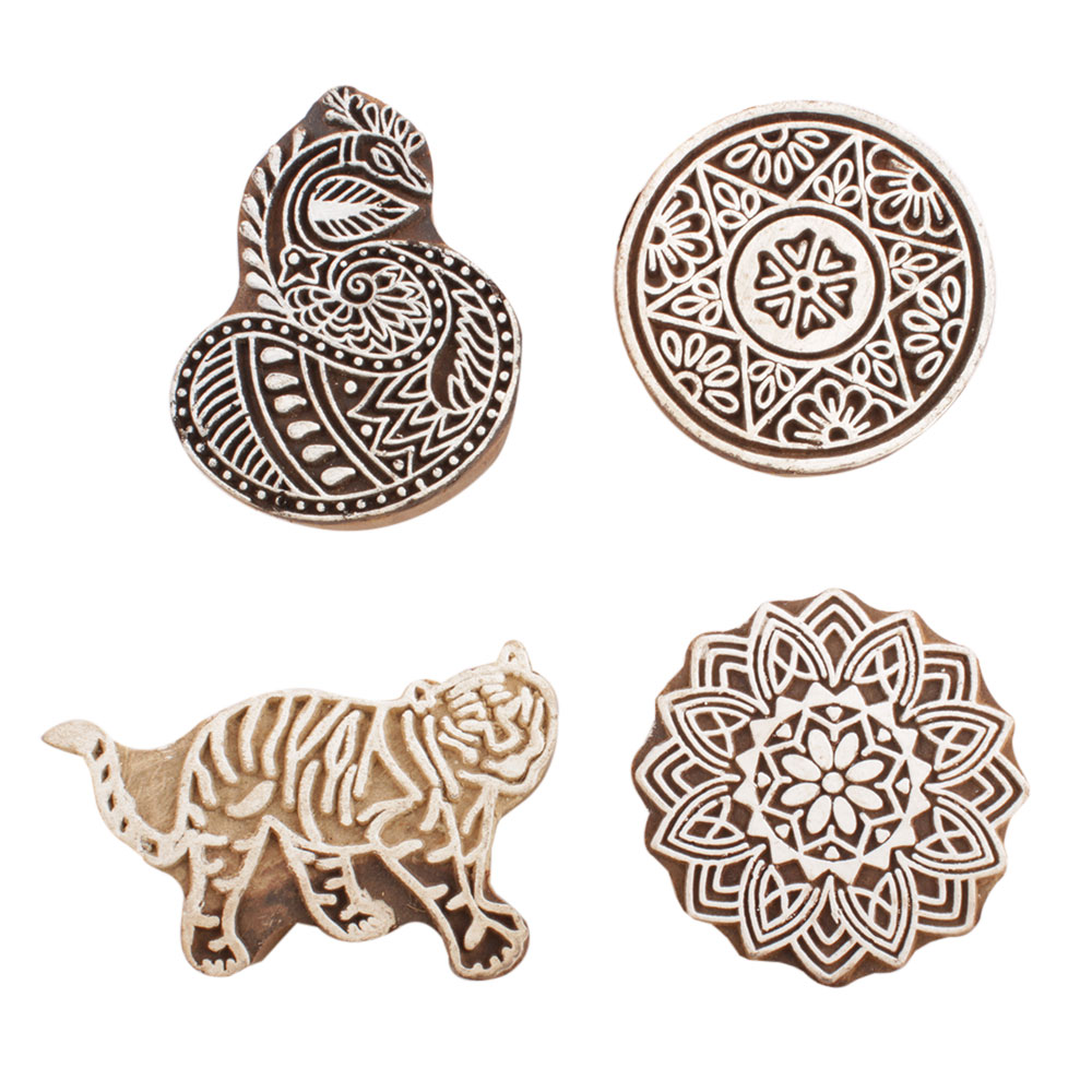 Set of 4 Piece New Mix Wooden Printing Block. Ideal for use on Fabric, Paper, Canvas, etc. These Blocks can be use to Print with Oil Colors, Fabric Colors, Water Colors, Acrylic Colors and Vegetable Colors.