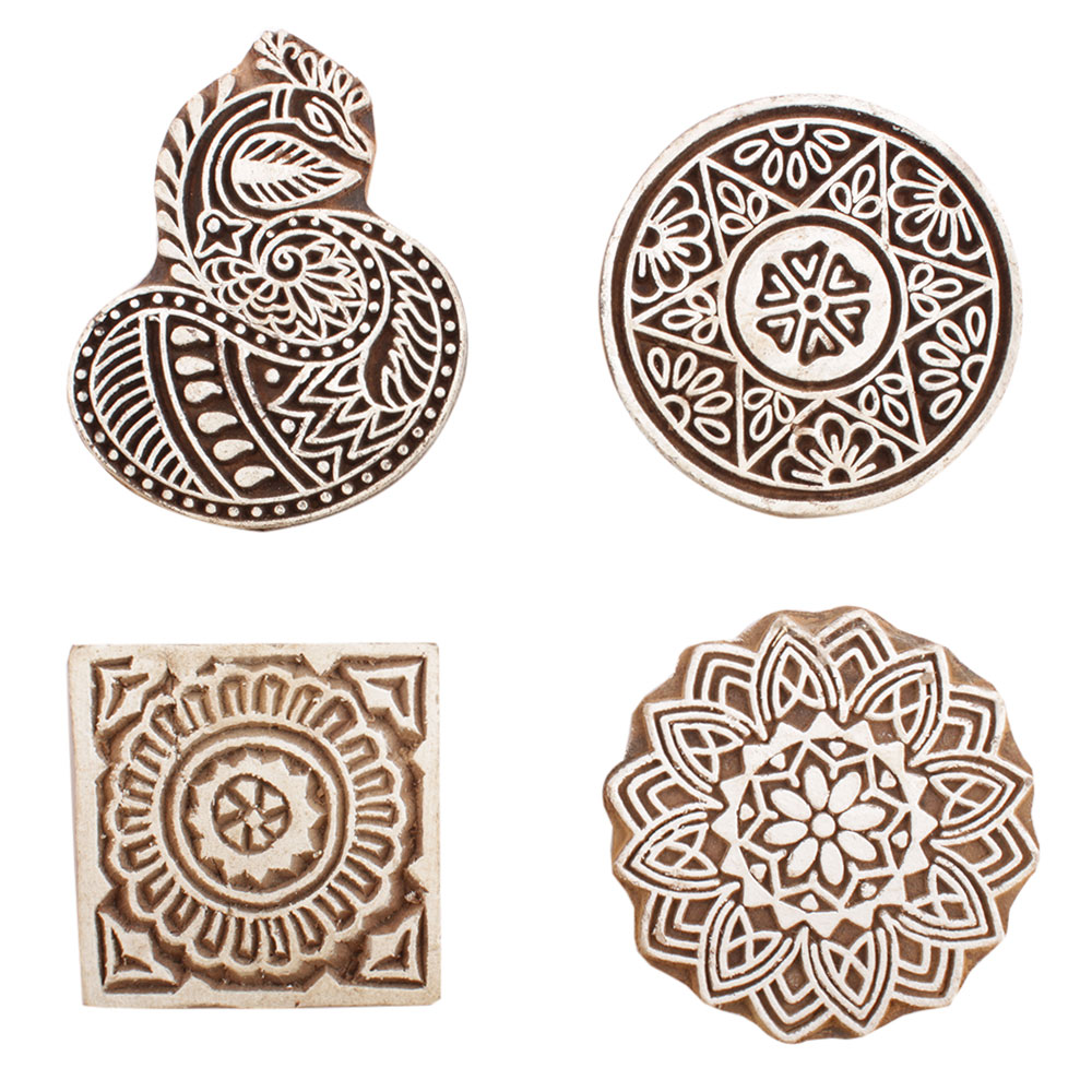 Set of 4 Piece New Mix Wooden Printing Block. Ideal for use on Fabric, Paper, Canvas, etc. These Blocks can be use to Print with Oil Colors, Fabric Colors, Water Colors, Acrylic Colors and Vegetable Colors.
