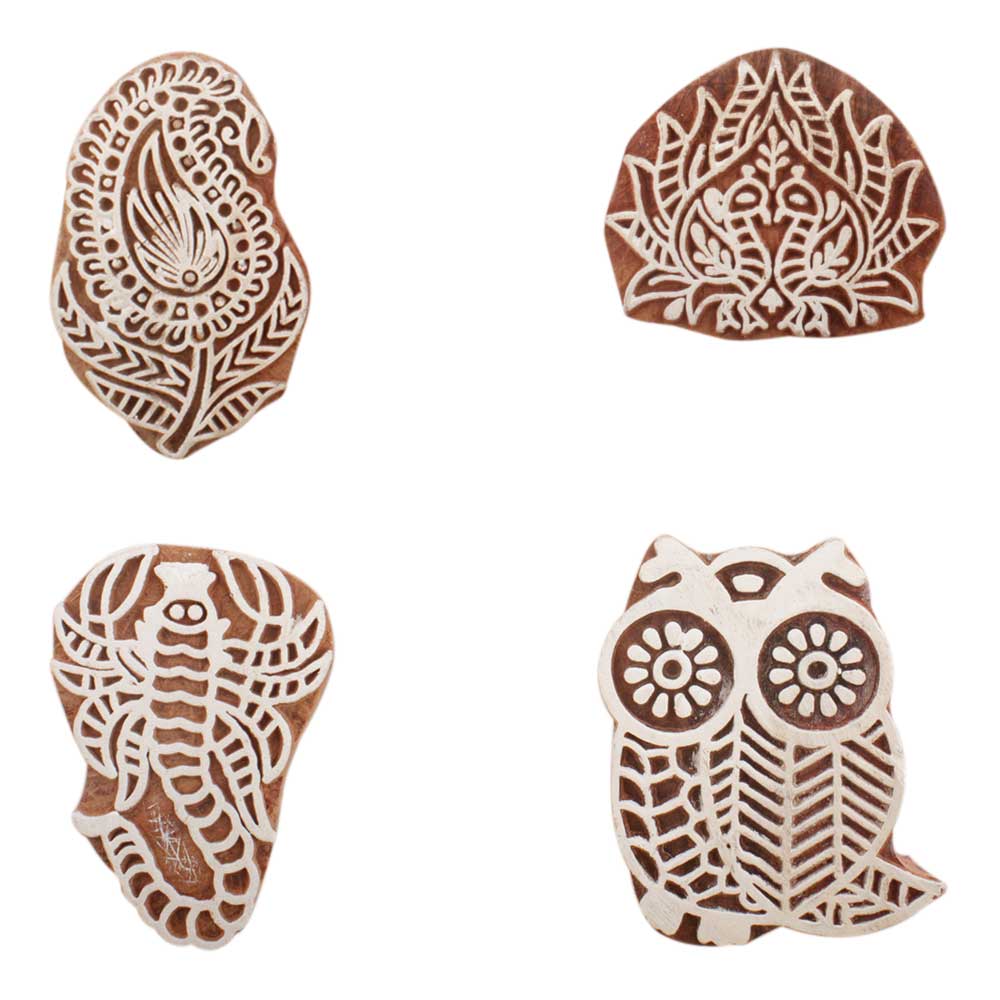 Set of 4 Piece New Mix Wooden Printing Block. Ideal for use on Fabric, Paper, Canvas, etc. These Blocks can be use to Print with Oil Colors, Fabric Colors, Water Colors, Acrylic Colors and Vegetable Colors.