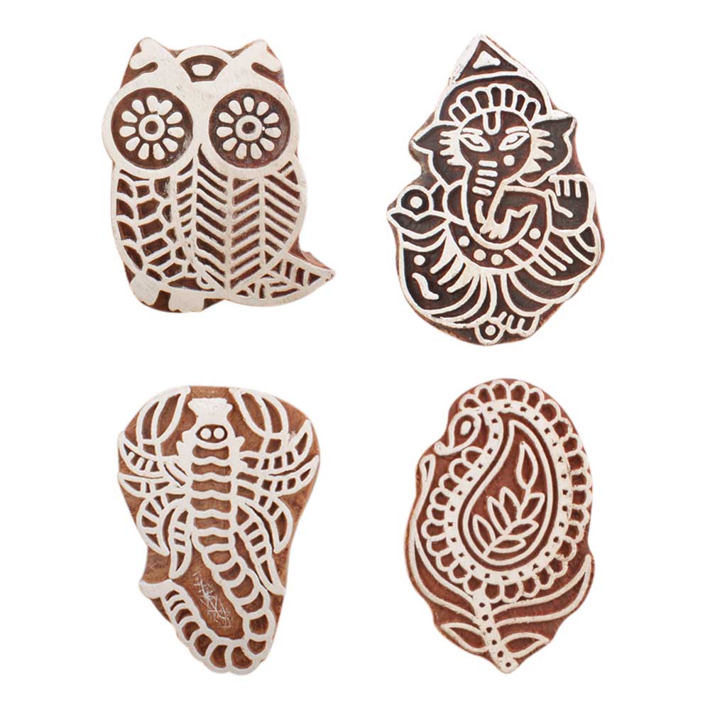 Set of 4 Piece New Mix Wooden Printing Block. Ideal for use on Fabric, Paper, Canvas, etc. These Blocks can be use to Print with Oil Colors, Fabric Colors, Water Colors, Acrylic Colors and Vegetable Colors.