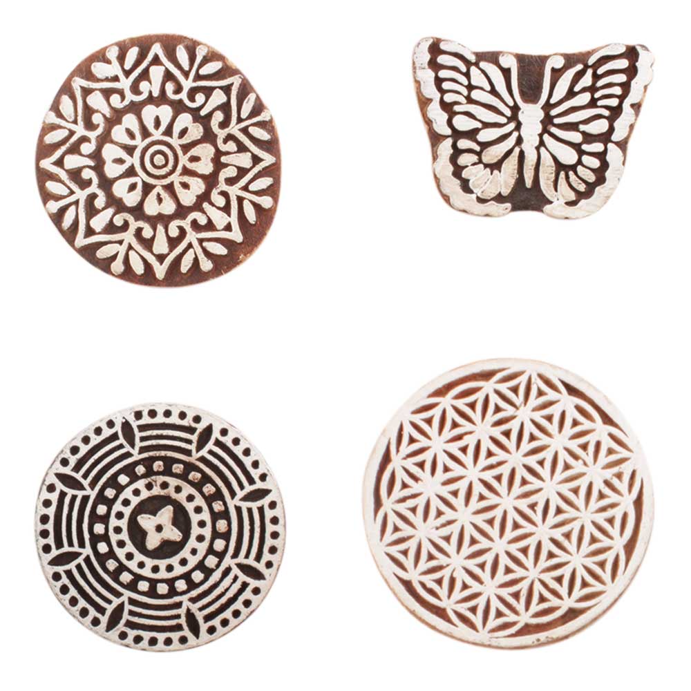 Set of 4 Piece New Mix Wooden Printing Block. Ideal for use on Fabric, Paper, Canvas, etc. These Blocks can be use to Print with Oil Colors, Fabric Colors, Water Colors, Acrylic Colors and Vegetable Colors.
