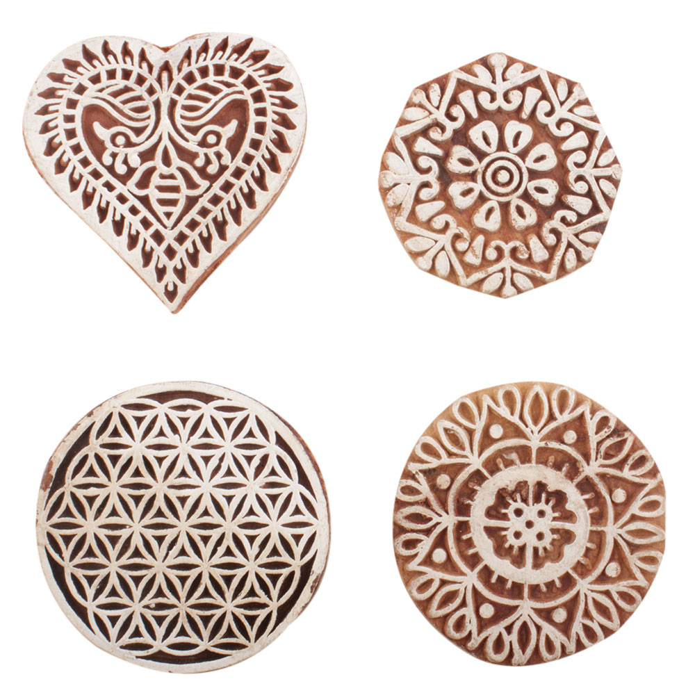 Set of 4 Piece New Mix Wooden Printing Block. Ideal for use on Fabric, Paper, Canvas, etc. These Blocks can be use to Print with Oil Colors, Fabric Colors, Water Colors, Acrylic Colors and Vegetable Colors.