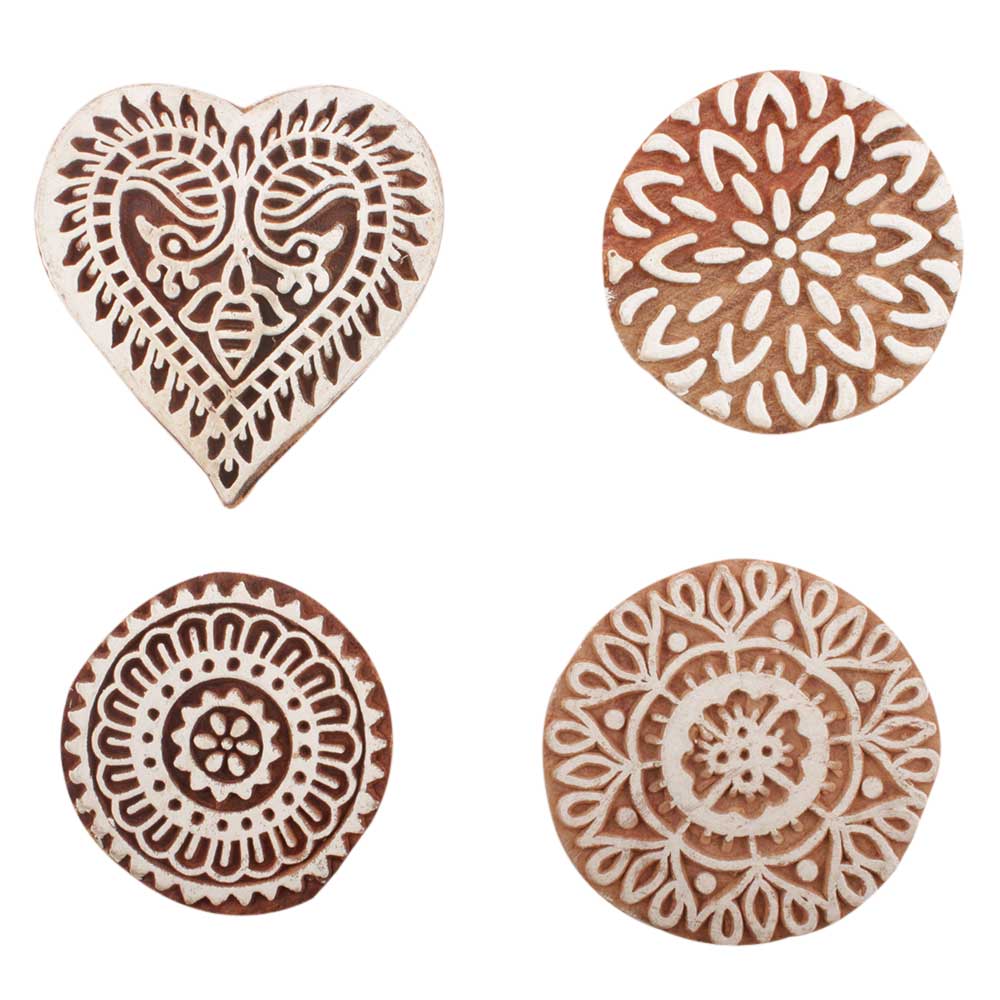 Set of 4 Piece New Mix Wooden Printing Block. Ideal for use on Fabric, Paper, Canvas, etc. These Blocks can be use to Print with Oil Colors, Fabric Colors, Water Colors, Acrylic Colors and Vegetable Colors.
