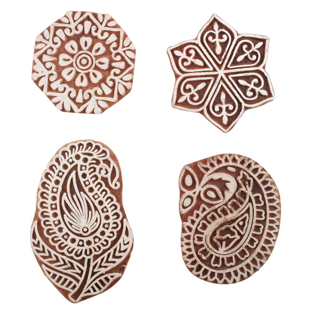 Set of 4 Piece New Mix Wooden Printing Block. Ideal for use on Fabric, Paper, Canvas, etc. These Blocks can be use to Print with Oil Colors, Fabric Colors, Water Colors, Acrylic Colors and Vegetable Colors.